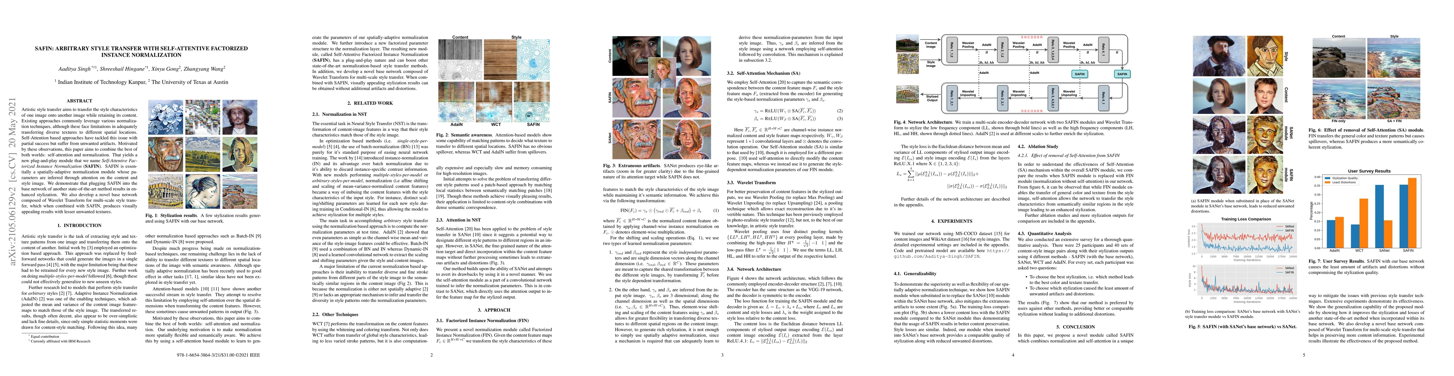 SAFIN introduces a Self-Attentive Factorized Instance Normalization module that combines self-attention and normalization to enhance artistic style transfer. This approach achieves better stylization by reducing unwanted artifacts and diverse texture issues in existing methods.