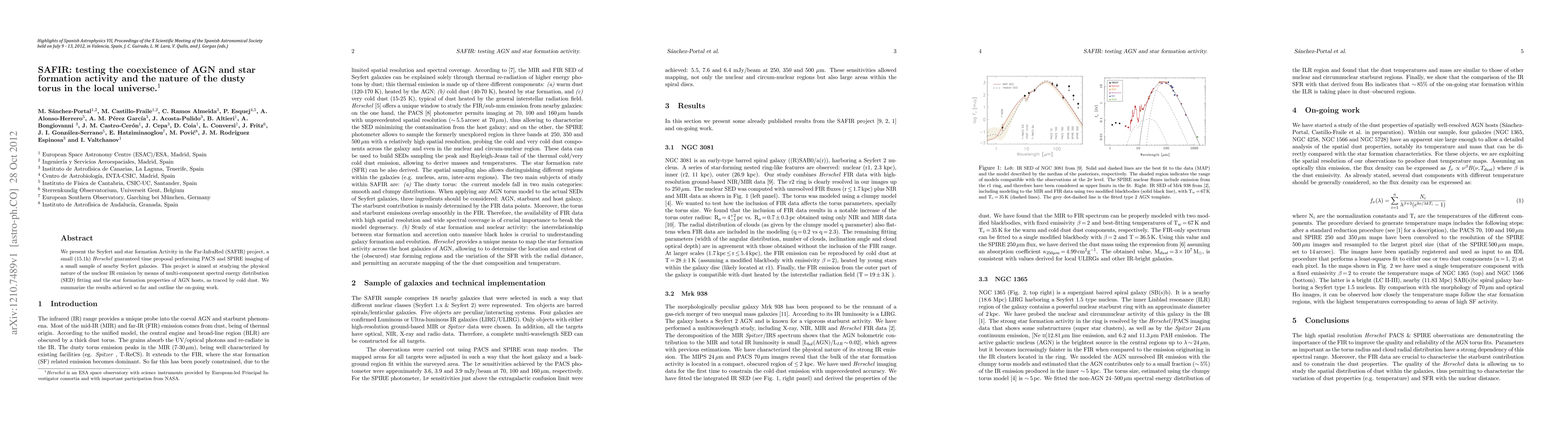 The SAFIR project, utilizing Herschel observations, examines the infrared emission of nearby Seyfert galaxies. It employs multi-component SED fitting to dissect the nuclear IR emission into AGN and star formation components, revealing the nature of the dusty torus and cold dust star formation properties in AGN hosts.