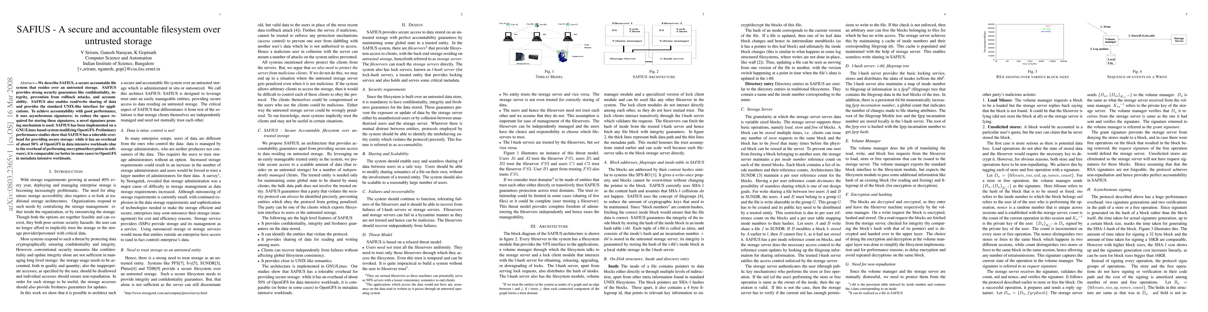 SAFIUS is a secure, accountable file system designed for untrusted storage, offering confidentiality, integrity, rollback prevention, and accountability. It uses asynchronous signatures for accountability and a signature pruning mechanism to minimize storage. Implemented on GNU/Linux with OpenGFS, SAFIUS shows a 50% performance overhead in data-intensive tasks due to software encryption/decryption but performs comparably or better in metadata-intensive tasks.