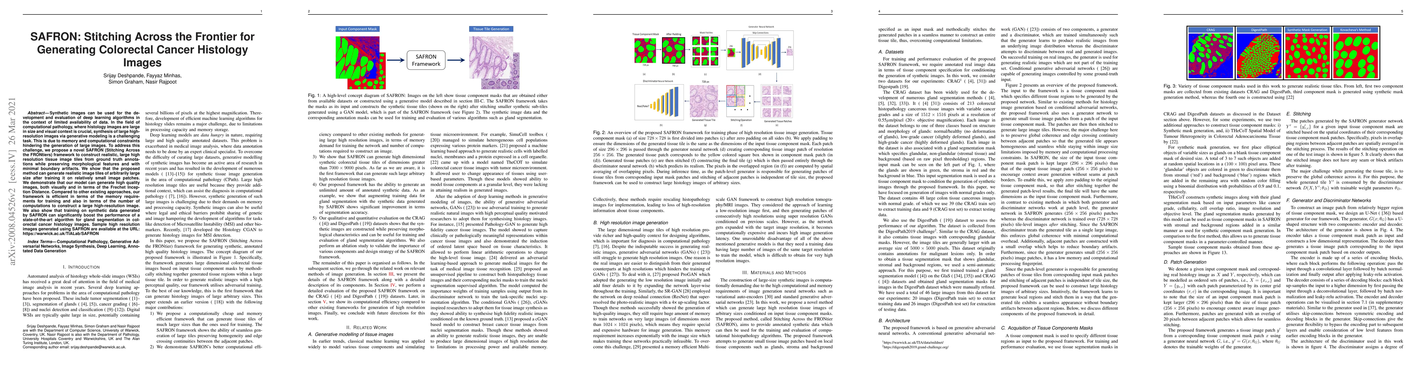 SAFRON is a novel framework for generating large, high-resolution colorectal cancer histology images by stitching together small patches, preserving morphological features, and minimizing artifacts. The method efficiently trains on small patches and significantly boosts the performance of gland segmentation algorithms.