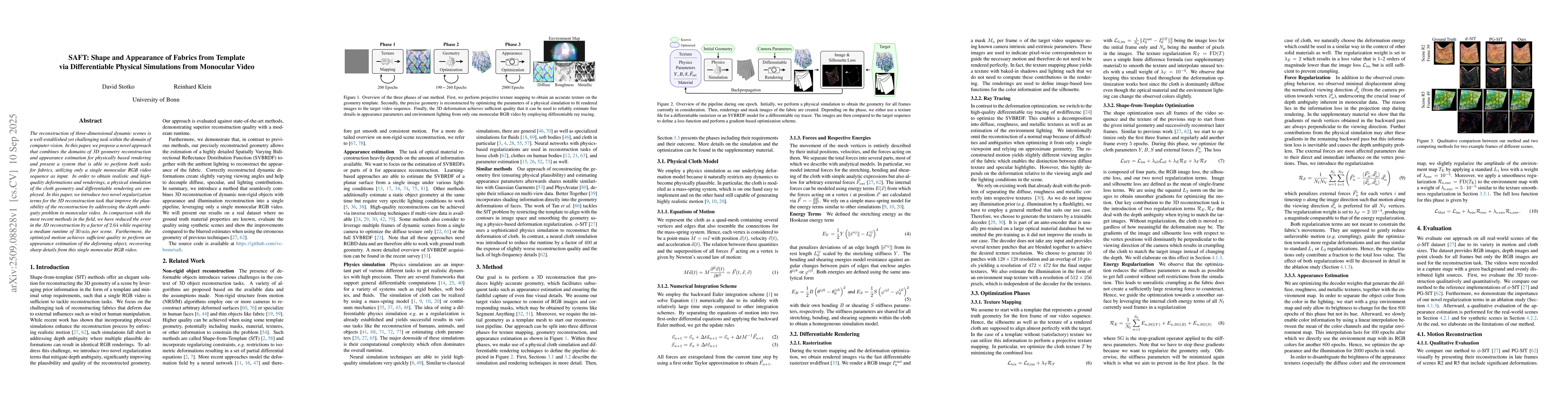 The reconstruction of three-dimensional dynamic scenes is a well-established yet challenging task within the domain of computer vision. In this paper, we propose a novel approach that combines the domains of 3D geometry reconstruction and appearance estimation for physically based rendering and present a system that is able to perform both tasks for fabrics, utilizing only a single monocular RGB video sequence as input. In order to obtain realistic and high-quality deformations and renderings, a physical simulation of the cloth geometry and differentiable rendering are employed. In this paper, we introduce two novel regularization terms for the 3D reconstruction task that improve the plausibility of the reconstruction by addressing the depth ambiguity problem in monocular video. In comparison with the most recent methods in the field, we have reduced the error in the 3D reconstruction by a factor of 2.64 while requiring a medium runtime of 30 min per scene. Furthermore, the optimized motion achieves sufficient quality to perform an appearance estimation of the deforming object, recovering sharp details from this single monocular RGB video.