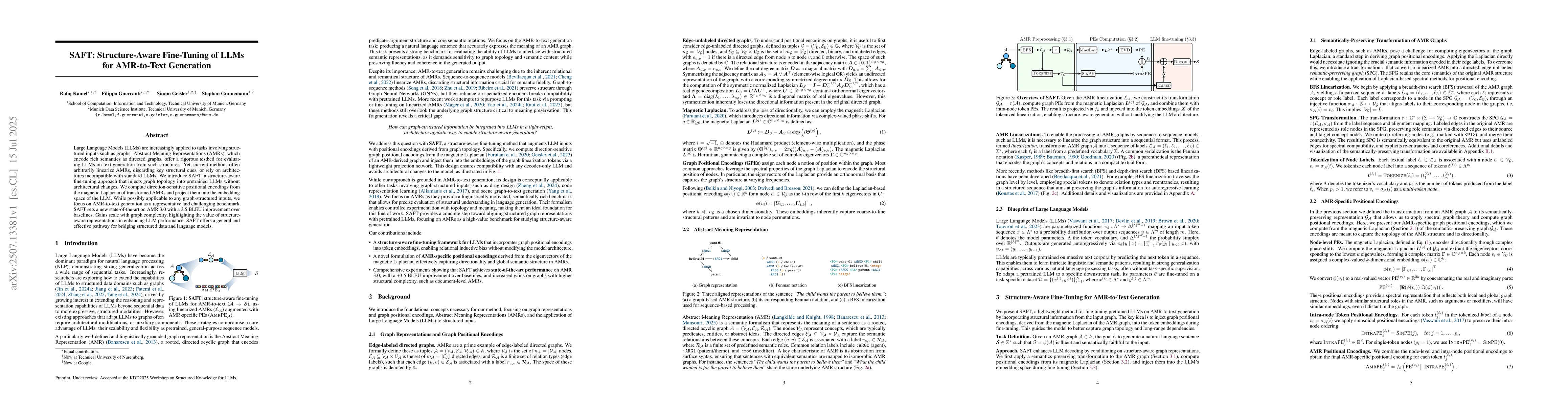 The research introduces SAFT (Structure-Aware Fine-Tuning), a method that enhances large language models' (LLMs) performance in generating text from Abstract Meaning Representation (AMR) graphs. SAFT injects graph topology into LLMs without altering their architecture by computing direction-sensitive positional encodings from the magnetic Laplacian of transformed AMRs and projecting them into the LLM's embedding space. This approach surpasses existing methods, achieving a 3.5 BLEU improvement on AMR 3.0 and demonstrating scalable gains with increasing graph complexity.
