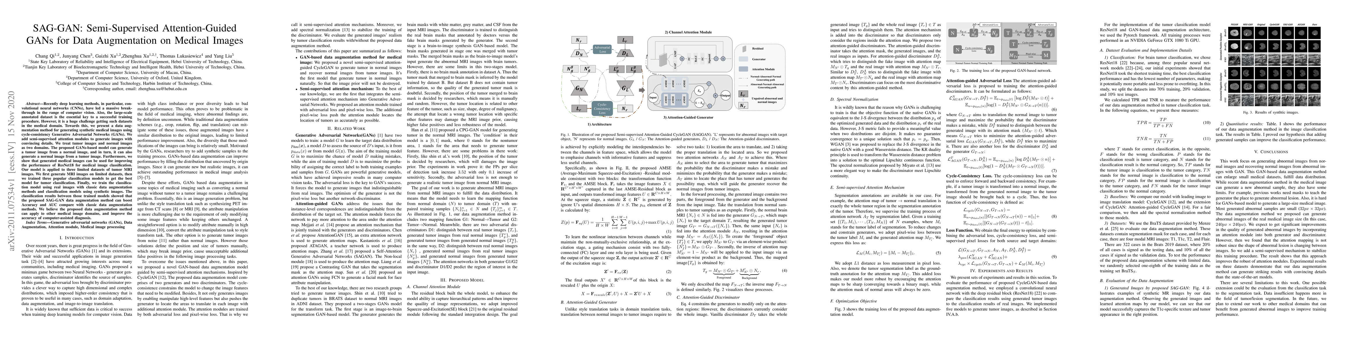 The SAG-GAN method introduces semi-supervised attention-guided GANs for generating synthetic medical images to augment limited datasets. The model effectively converts tumor and normal MRI images, enhancing ResNet18 classification performance, and demonstrates improved accuracy and AUC compared to traditional data augmentation techniques.