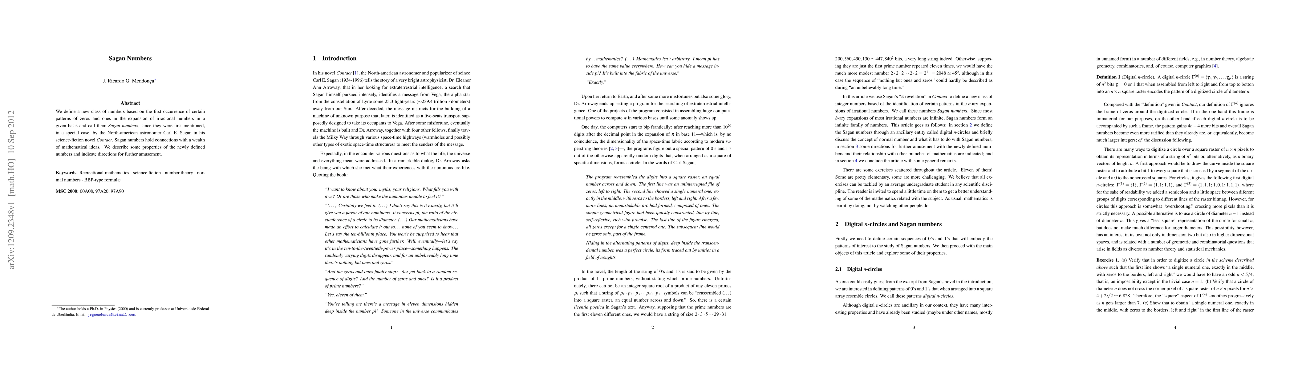 The concept of Sagan numbers, inspired by a fictional novel, offers a unique blend of recreational mathematics with deeper theoretical connections to normal numbers and computational geometry.