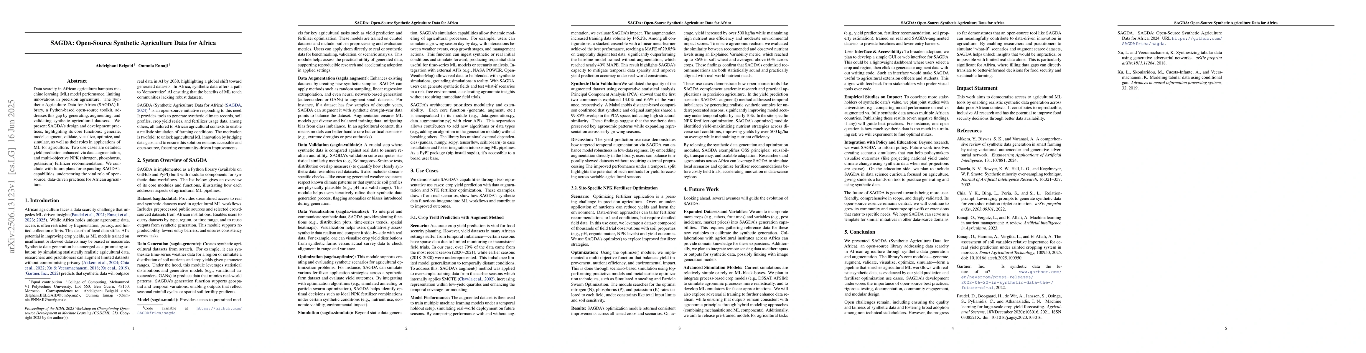 SAGDA is a Python-based open-source toolkit that generates, augments, and validates synthetic agricultural datasets for Africa, addressing data scarcity issues in precision agriculture through machine learning model applications.