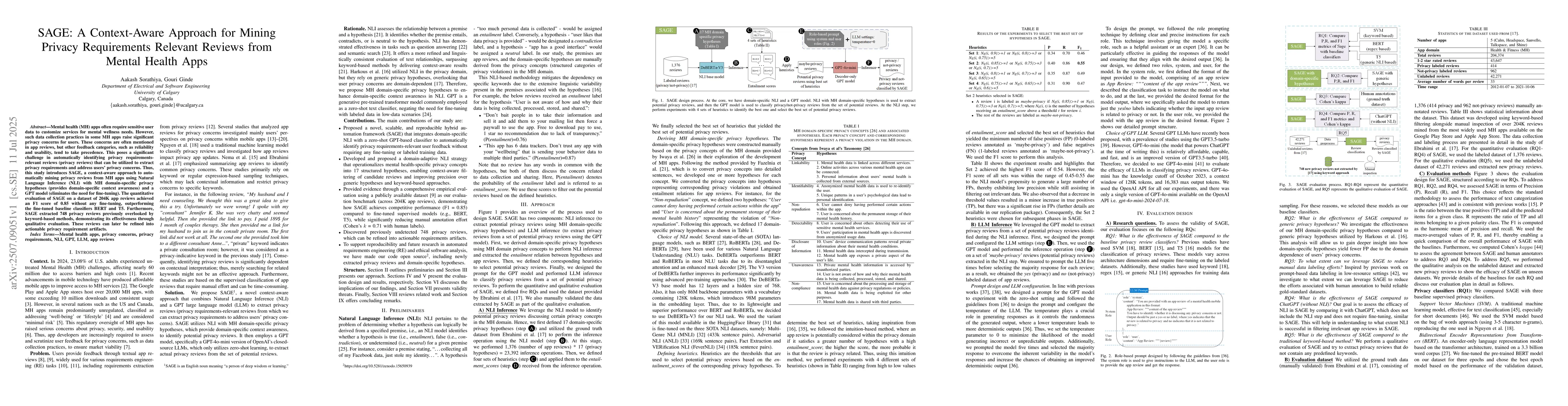 Mental health (MH) apps often require sensitive user data to customize services for mental wellness needs. However, such data collection practices in some MH apps raise significant privacy concerns for users. These concerns are often mentioned in app reviews, but other feedback categories, such as reliability and usability, tend to take precedence. This poses a significant challenge in automatically identifying privacy requirements-relevant reviews (privacy reviews) that can be utilized to extract privacy requirements and address users' privacy concerns. Thus, this study introduces SAGE, a context-aware approach to automatically mining privacy reviews from MH apps using Natural Language Inference (NLI) with MH domain-specific privacy hypotheses (provides domain-specific context awareness) and a GPT model (eliminates the need for fine-tuning). The quantitative evaluation of SAGE on a dataset of 204K app reviews achieved an F1 score of 0.85 without any fine-tuning, outperforming the fine-tuned baseline classifiers BERT and T5. Furthermore, SAGE extracted 748 privacy reviews previously overlooked by keyword-based methods, demonstrating its effectiveness through qualitative evaluation. These reviews can later be refined into actionable privacy requirement artifacts.