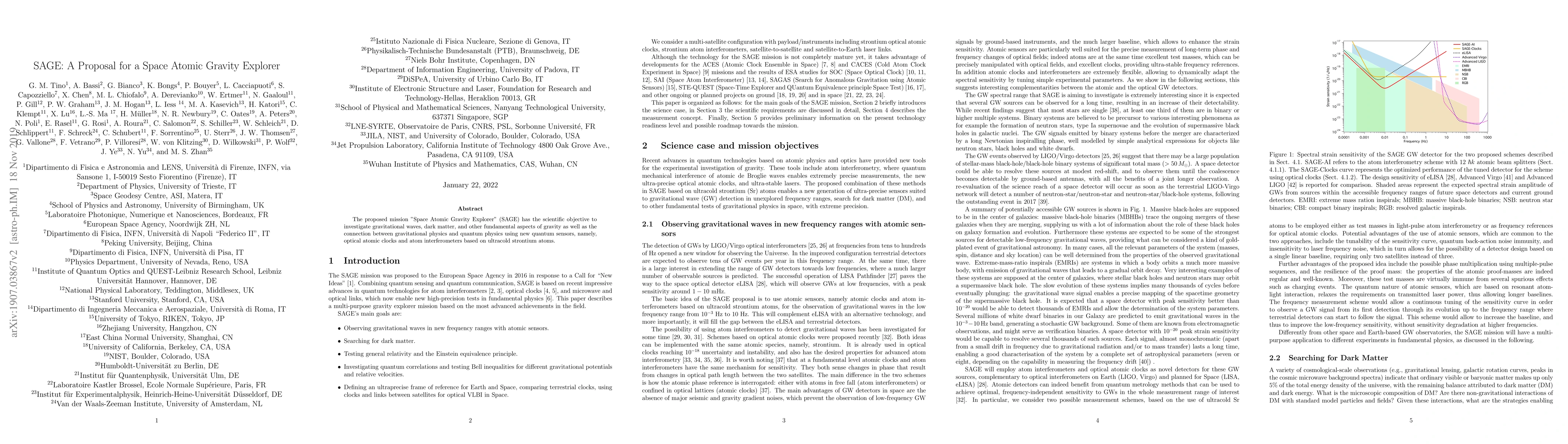 The proposed mission "Space Atomic Gravity Explorer" (SAGE) has the scientific objective to investigate gravitational waves, dark matter, and other fundamental aspects of gravity as well as the connection between gravitational physics and quantum physics using new quantum sensors, namely, optical atomic clocks and atom interferometers based on ultracold strontium atoms.