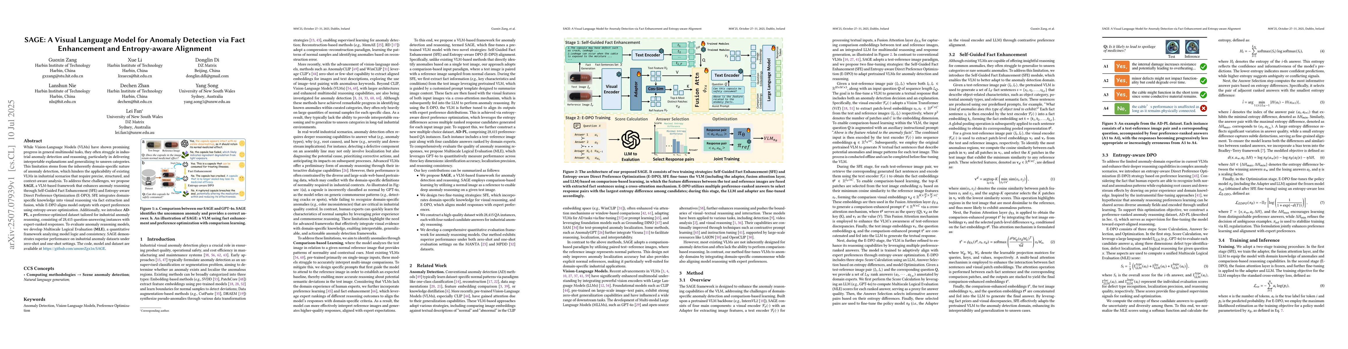 While Vision-Language Models (VLMs) have shown promising progress in general multimodal tasks, they often struggle in industrial anomaly detection and reasoning, particularly in delivering interpretable explanations and generalizing to unseen categories. This limitation stems from the inherently domain-specific nature of anomaly detection, which hinders the applicability of existing VLMs in industrial scenarios that require precise, structured, and context-aware analysis. To address these challenges, we propose SAGE, a VLM-based framework that enhances anomaly reasoning through Self-Guided Fact Enhancement (SFE) and Entropy-aware Direct Preference Optimization (E-DPO). SFE integrates domain-specific knowledge into visual reasoning via fact extraction and fusion, while E-DPO aligns model outputs with expert preferences using entropy-aware optimization. Additionally, we introduce AD-PL, a preference-optimized dataset tailored for industrial anomaly reasoning, consisting of 28,415 question-answering instances with expert-ranked responses. To evaluate anomaly reasoning models, we develop Multiscale Logical Evaluation (MLE), a quantitative framework analyzing model logic and consistency. SAGE demonstrates superior performance on industrial anomaly datasets under zero-shot and one-shot settings. The code, model and dataset are available at https://github.com/amoreZgx1n/SAGE.