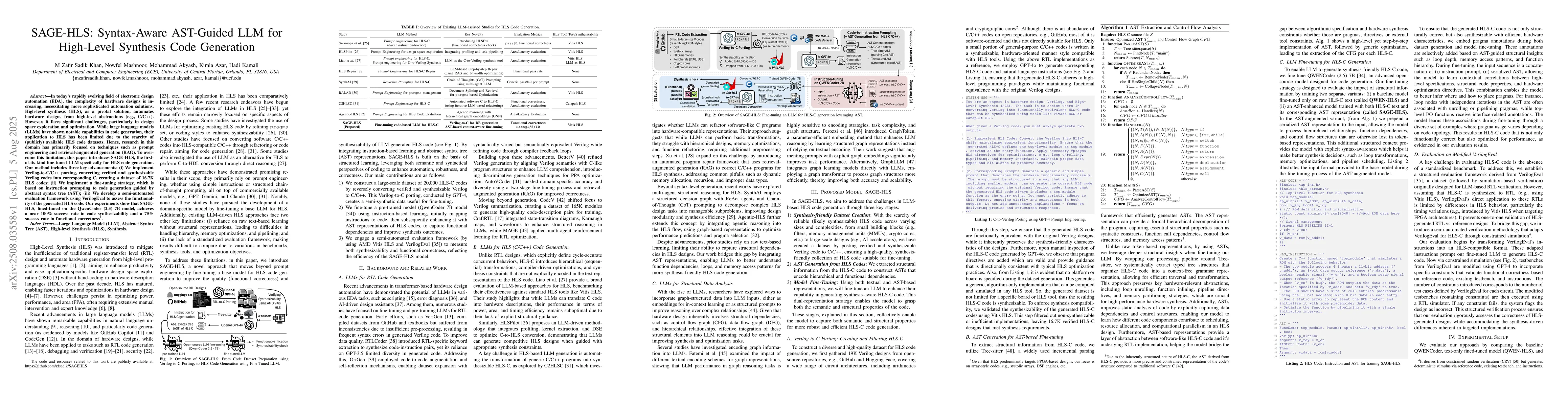 In today's rapidly evolving field of electronic design automation (EDA), the complexity of hardware designs is increasing, necessitating more sophisticated automation solutions. High-level synthesis (HLS), as a pivotal solution, automates hardware designs from high-level abstractions (e.g., C/C++). However, it faces significant challenges, particularly in design space exploration and optimization. While large language models (LLMs) have shown notable capabilities in code generation, their application to HLS has been limited due to the scarcity of (publicly) available HLS code datasets. Hence, research in this domain has primarily focused on techniques such as prompt engineering and retrieval-augmented generation (RAG). To overcome this limitation, this paper introduces SAGE-HLS, the first-of-its-kind fine-tuned LLM specifically for HLS code generation. Our method includes three key advancements: (i) We implement Verilog-to-C/C++ porting, converting verified and synthesizable Verilog codes into corresponding C, creating a dataset of 16.7K HLS codes; (ii) We implement a fine-tuning strategy, which is based on instruction prompting to code generation guided by abstract syntax tree (AST); (iii) We develop a semi-automated evaluation framework using VerilogEval to assess the functionality of the generated HLS code. Our experiments show that SAGE-HLS, fined-tuned on the QwenCoder (2.5) 7B model, achieves a near 100% success rate in code synthesizability and a 75% success rate in functional correctness.