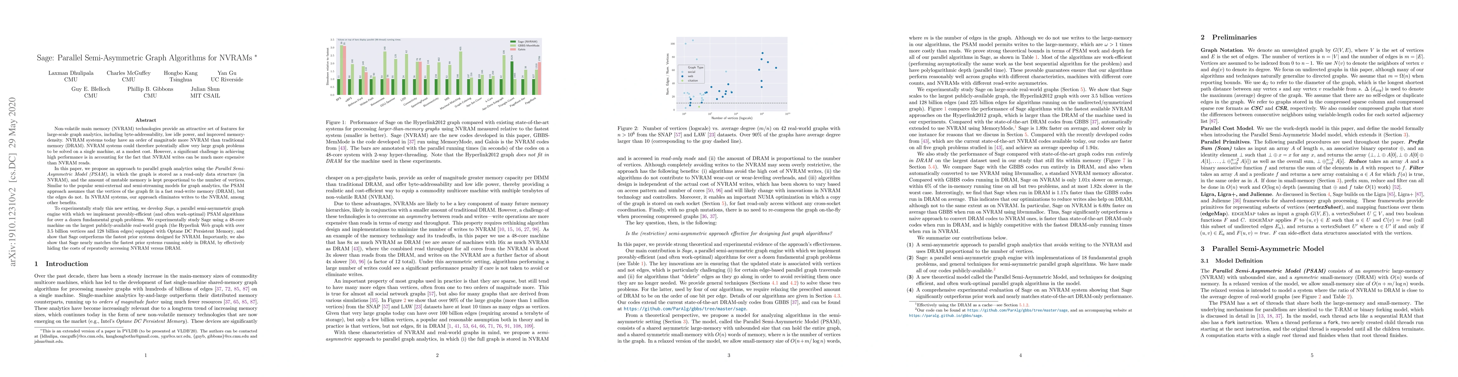 The paper introduces Sage, a parallel semi-asymmetric graph engine designed for NVRAM systems, which outperforms prior NVRAM systems for large-scale graph analytics. Sage leverages the PSAM model, minimizing NVRAM writes and efficiently handling graph problems with vertices fitting in DRAM and edges in NVRAM. Experiments on a 48-core machine with Optane DC Persistent Memory demonstrate Sage's superior performance compared to existing NVRAM systems and near-equivalent performance to DRAM-only systems, effectively concealing NVRAM access costs.