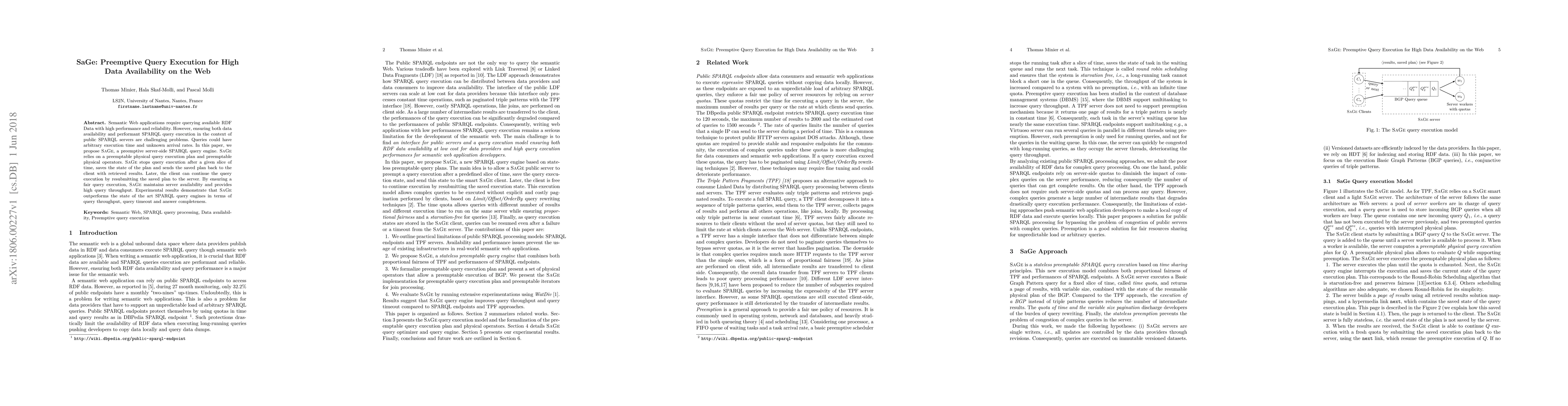 SaGe is a preemptive server-side SPARQL query engine designed to enhance performance and reliability for Semantic Web applications by managing query execution through state saving and resuming. It outperforms existing SPARQL engines in query throughput and answer completeness.
