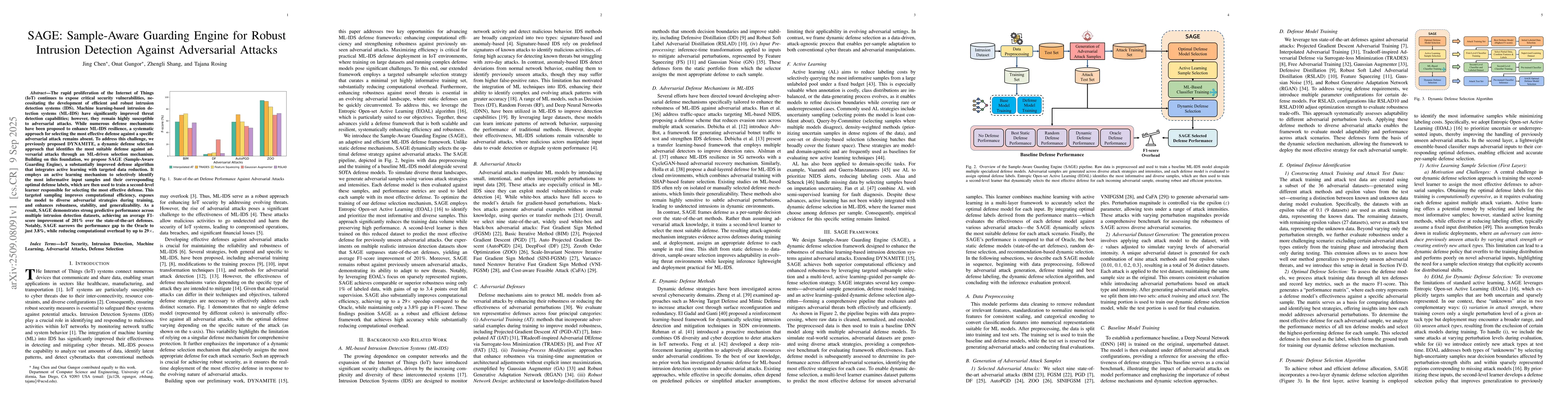 The rapid proliferation of the Internet of Things (IoT) continues to expose critical security vulnerabilities, necessitating the development of efficient and robust intrusion detection systems (IDS). Machine learning-based intrusion detection systems (ML-IDS) have significantly improved threat detection capabilities; however, they remain highly susceptible to adversarial attacks. While numerous defense mechanisms have been proposed to enhance ML-IDS resilience, a systematic approach for selecting the most effective defense against a specific adversarial attack remains absent. To address this challenge, we previously proposed DYNAMITE, a dynamic defense selection approach that identifies the most suitable defense against adversarial attacks through an ML-driven selection mechanism. Building on this foundation, we propose SAGE (Sample-Aware Guarding Engine), a substantially improved defense algorithm that integrates active learning with targeted data reduction. It employs an active learning mechanism to selectively identify the most informative input samples and their corresponding optimal defense labels, which are then used to train a second-level learner responsible for selecting the most effective defense. This targeted sampling improves computational efficiency, exposes the model to diverse adversarial strategies during training, and enhances robustness, stability, and generalizability. As a result, SAGE demonstrates strong predictive performance across multiple intrusion detection datasets, achieving an average F1-score improvement of 201% over the state-of-the-art defenses. Notably, SAGE narrows the performance gap to the Oracle to just 3.8%, while reducing computational overhead by up to 29x.