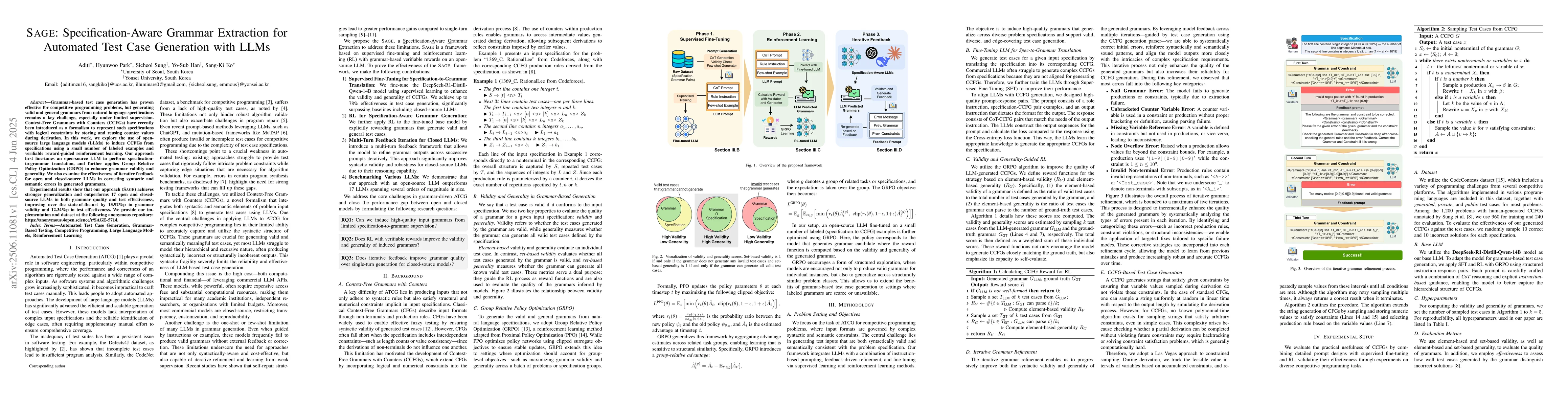 The research introduces SAGE, a method using open-source large language models (LLMs) to generate Context-Free Grammars with Counters (CCFGs) from natural language specifications. SAGE fine-tunes LLMs for specification-to-grammar translation and employs Group Relative Policy Optimization (GRPO) to enhance grammar validity and generality. Experiments demonstrate SAGE outperforms 17 other LLMs in grammar quality and test effectiveness, improving upon the state-of-the-art by 15.92%p in grammar validity and 12.34%p in test effectiveness.