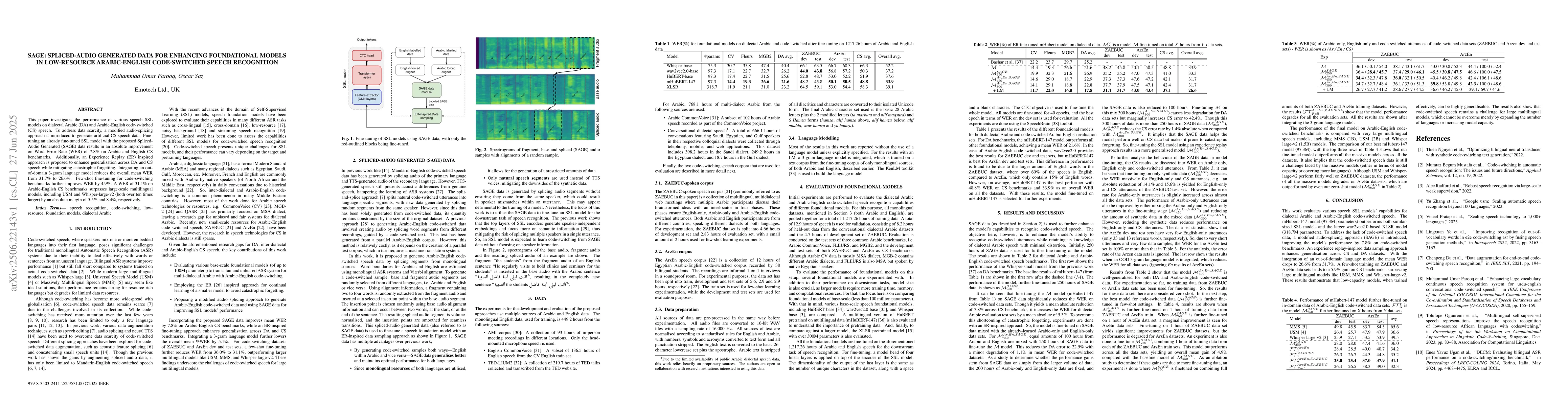 This paper investigates the performance of various speech SSL models on dialectal Arabic (DA) and Arabic-English code-switched (CS) speech. To address data scarcity, a modified audio-splicing approach is introduced to generate artificial CS speech data. Fine-tuning an already fine-tuned SSL model with the proposed Spliced-Audio Generated (SAGE) data results in an absolute improvement on Word Error Rate (WER) of 7.8% on Arabic and English CS benchmarks. Additionally, an Experience Replay (ER) inspired approach is proposed to enhance generalisation across DA and CS speech while mitigating catastrophic forgetting. Integrating an out-of-domain 3-gram language model reduces the overall mean WER from 31.7% to 26.6%. Few-shot fine-tuning for code-switching benchmarks further improves WER by 4.9%. A WER of 31.1% on Arabic-English CS benchmarks surpasses large-scale multilingual models, including USM and Whisper-large-v2 (both over ten times larger) by an absolute margin of 5.5% and 8.4%, respectively.