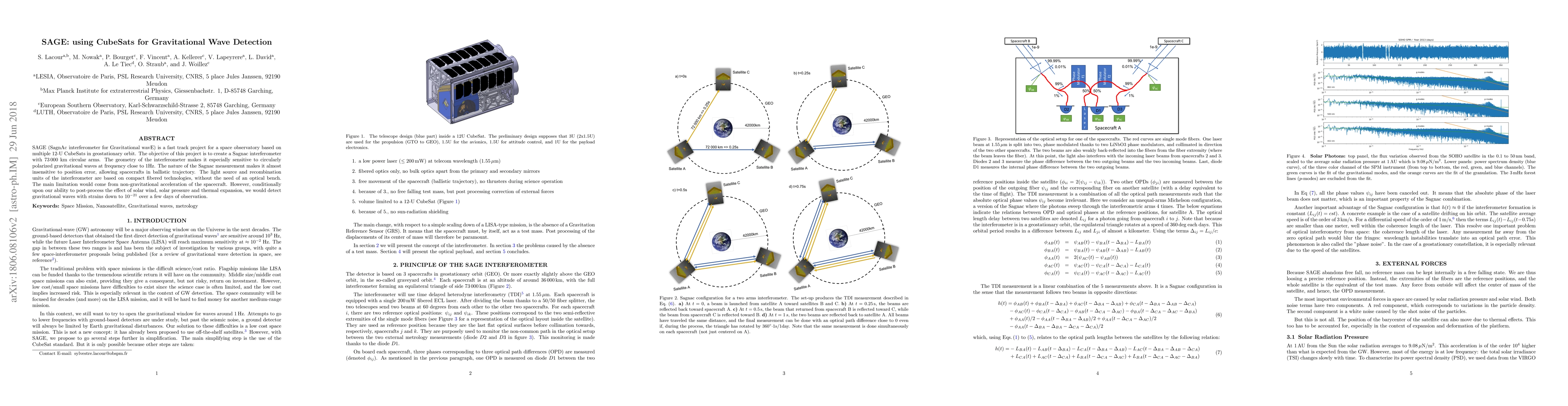SAGE (SagnAc interferometer for Gravitational wavE) is a fast track project for a space observatory based on multiple 12-U CubeSats in geostationary orbit. The objective of this project is to create a Sagnac interferometer with 73000 km circular arms. The geometry of the interferometer makes it especially sensitive to circularly polarized gravitational waves at frequency close to 1 Hz. The nature of the Sagnac measurement makes it almost insensitive to position error, allowing spacecrafts in ballistic trajectory. The light source and recombination units of the interferometer are based on compact fibered technologies, without the need of an optical bench. The main limitation would come from non-gravitational acceleration of the spacecraft. However, conditionally upon our ability to post-process the effect of solar wind, solar pressure and thermal expansion, we would detect gravitational waves with strains down to 10^-21 over a few days of observation.