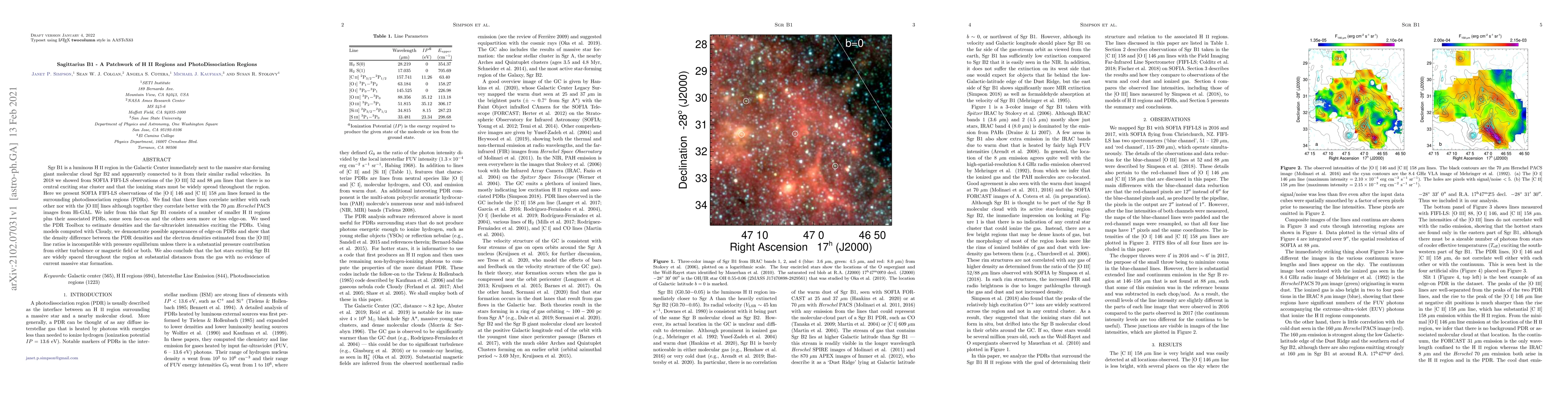 Sagittarius B1 is composed of multiple H II regions interspersed with photodissociation regions (PDRs), with no central star cluster. The spatial distribution of ionizing stars and the lack of pressure equilibrium suggest turbulence or magnetic fields significantly contribute to the region's dynamics.