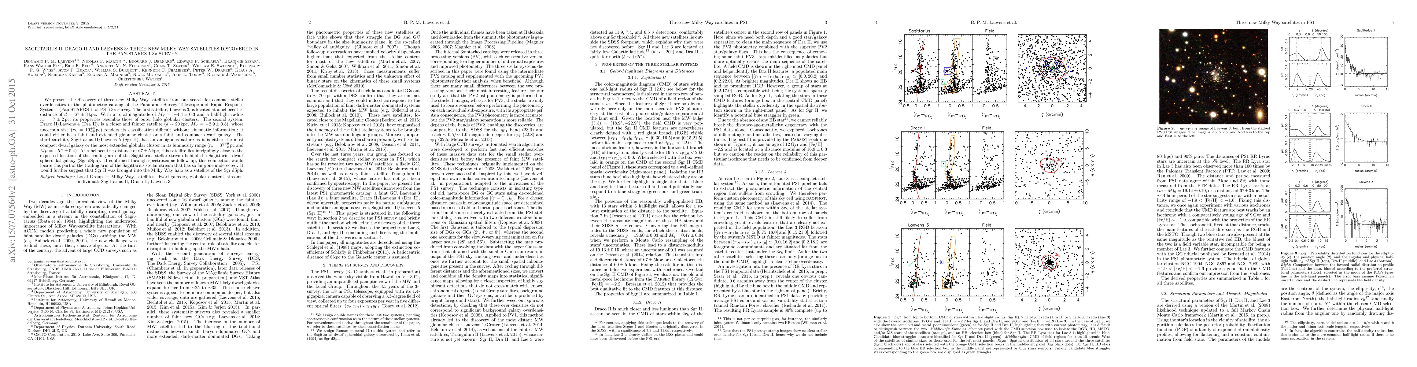 This paper reports the discovery of three new Milky Way satellite galaxies—Laevens 3, Draco II, and Sagittarius II—identified in the Pan-STARRS 1 3pi Survey. These satellites exhibit diverse properties, with Laevens 3 resembling outer halo globular clusters, Draco II being a faint and possibly extended object, and Sagittarius II potentially linked to the Sagittarius stellar stream.