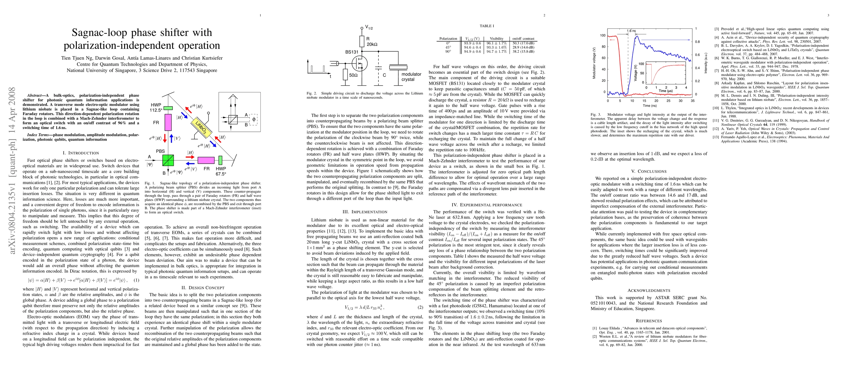 This research demonstrates a bulk-optics, polarization-independent phase shifter using a lithium niobate electro-optic modulator in a Sagnac-loop configuration with Faraday rotators, achieving an on/off contrast of 96% and a switching time of 1.6 ns for photonic quantum information applications.