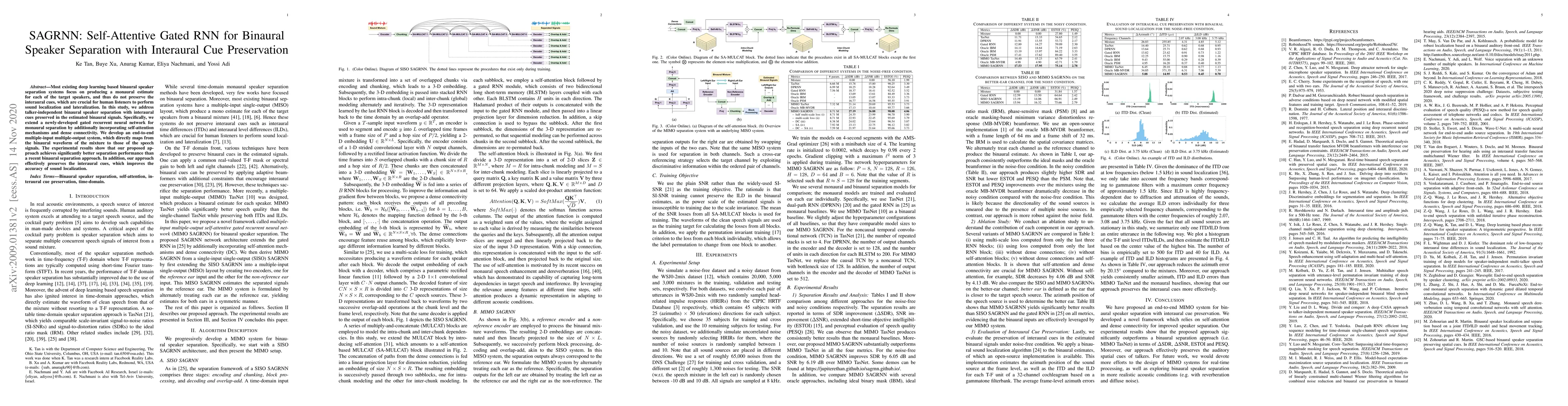 This paper proposes SAGRNN, a self-attentive gated RNN for binaural speaker separation that preserves interaural cues, crucial for sound localization. The method outperforms existing monaural separation techniques and effectively maintains spatial audio features.