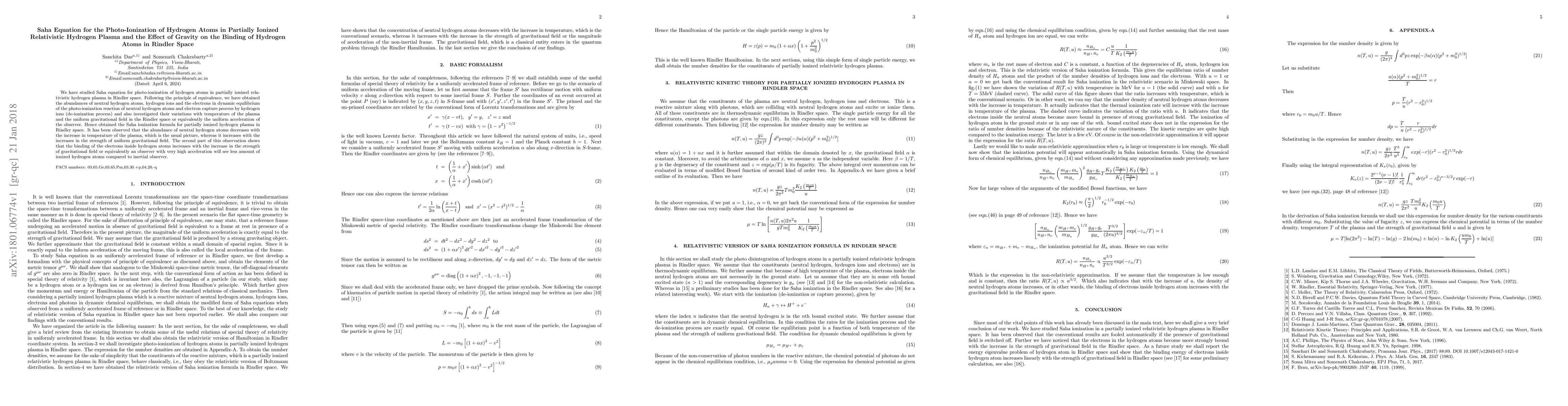 This paper investigates the Saha equation for photo-ionization of hydrogen atoms in a relativistic hydrogen plasma in Rindler space, revealing how temperature and uniform gravitational fields affect ionization states. The study finds that while temperature decreases neutral hydrogen abundance, increased gravitational fields enhance it, indicating stronger electron binding under stronger gravity.