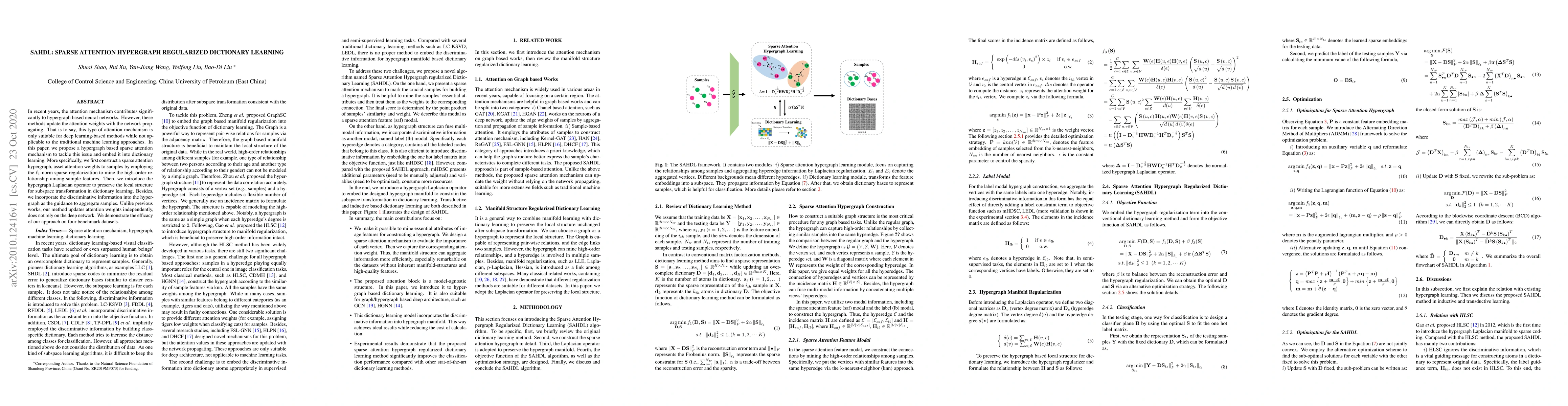 This paper proposes a sparse attention hypergraph regularized dictionary learning method that updates attention weights independently, making it applicable to traditional machine learning. The method employs $\ell_1$-norm regularization for high-order feature relationships and uses the hypergraph Laplacian operator for local structure preservation in dictionary learning.