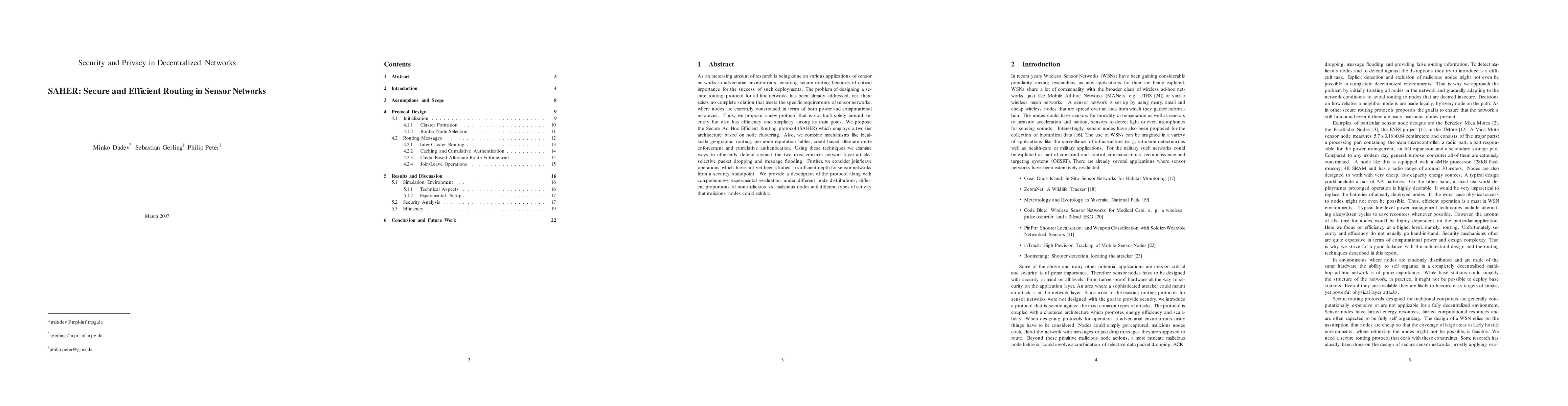 The SAHER protocol proposes a secure and efficient routing solution for sensor networks, employing a two-tier architecture based on clustering and combining geographic routing, reputation systems, and cumulative authentication to defend against common attacks while maintaining simplicity and efficiency. Experimental evaluations demonstrate its effectiveness under various network conditions and attack scenarios.