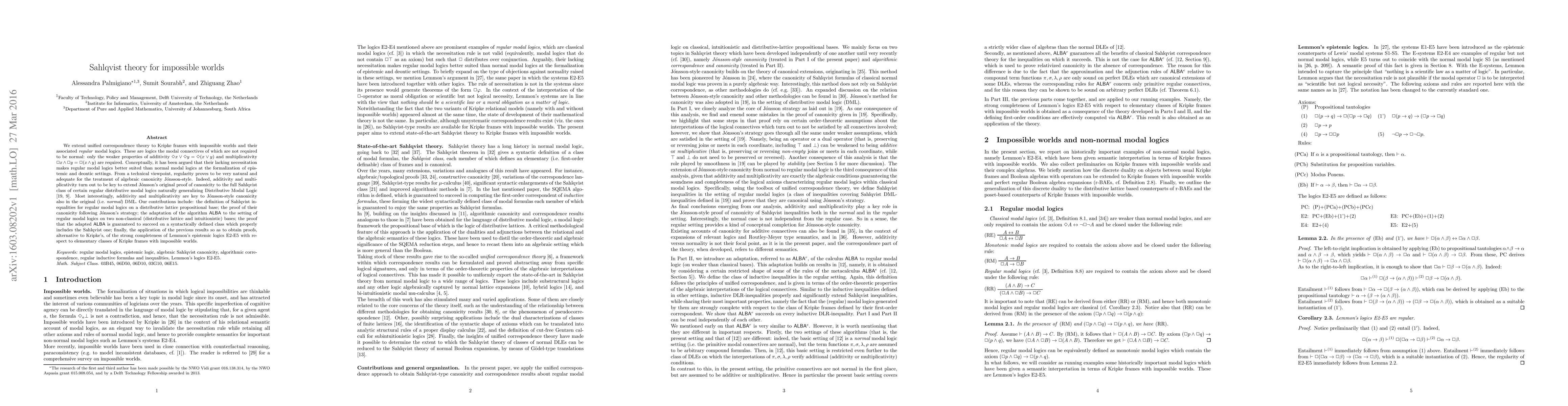 We extend unified correspondence theory to Kripke frames with impossible worlds and their associated regular modal logics. These are logics the modal connectives of which are not required to be normal: only the weaker properties of additivity and multiplicativity are required. Conceptually, it has been argued that their lacking necessitation makes regular modal logics better suited than normal modal logics at the formalization of epistemic and deontic settings. From a technical viewpoint, regularity proves to be very natural and adequate for the treatment of algebraic canonicity J\'onsson-style. Indeed, additivity and multiplicativity turn out to be key to extend J\'onsson's original proof of canonicity to the full Sahlqvist class of certain regular distributive modal logics naturally generalizing Distributive Modal Logic. Most interestingly, additivity and multiplicativity are key to J\'onsson-style canonicity also in the original (i.e. normal) DML. Our contributions include: the definition of Sahlqvist inequalities for regular modal logics on a distributive lattice propositional base; the proof of their canonicity following J\'onsson's strategy; the adaptation of the algorithm ALBA to the setting of regular modal logics on two non-classical (distributive lattice and intuitionistic) bases; the proof that the adapted ALBA is guaranteed to succeed on a syntactically defined class which properly includes the Sahlqvist one; finally, the application of the previous results so as to obtain proofs, alternative to Kripke's, of the strong completeness of Lemmon's epistemic logics E2-E5 with respect to elementary classes of Kripke frames with impossible worlds.