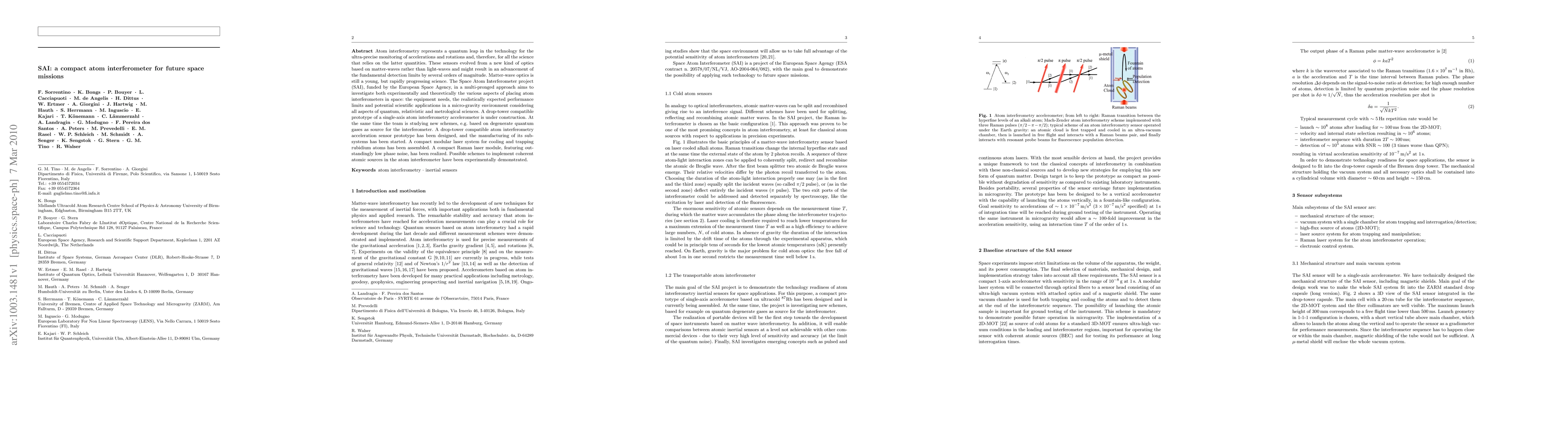 Atom interferometry represents a quantum leap in the technology for the ultra-precise monitoring of accelerations and rotations and, therefore, for all the science that relies on the latter quantities. These sensors evolved from a new kind of optics based on matter-waves rather than light-waves and might result in an advancement of the fundamental detection limits by several orders of magnitude. Matter-wave optics is still a young, but rapidly progressing science. The Space Atom Interferometer project (SAI), funded by the European Space Agency, in a multi-pronged approach aims to investigate both experimentally and theoretically the various aspects of placing atom interferometers in space: the equipment needs, the realistically expected performance limits and potential scientific applications in a micro-gravity environment considering all aspects of quantum, relativistic and metrological sciences. A drop-tower compatible prototype of a single-axis atom interferometry accelerometer is under construction. At the same time the team is studying new schemes, e.g. based on degenerate quantum gases as source for the interferometer. A drop-tower compatible atom interferometry acceleration sensor prototype has been designed, and the manufacturing of its subsystems has been started. A compact modular laser system for cooling and trapping rubidium atoms has been assembled. A compact Raman laser module, featuring outstandingly low phase noise, has been realized. Possible schemes to implement coherent atomic sources in the atom interferometer have been experimentally demonstrated.