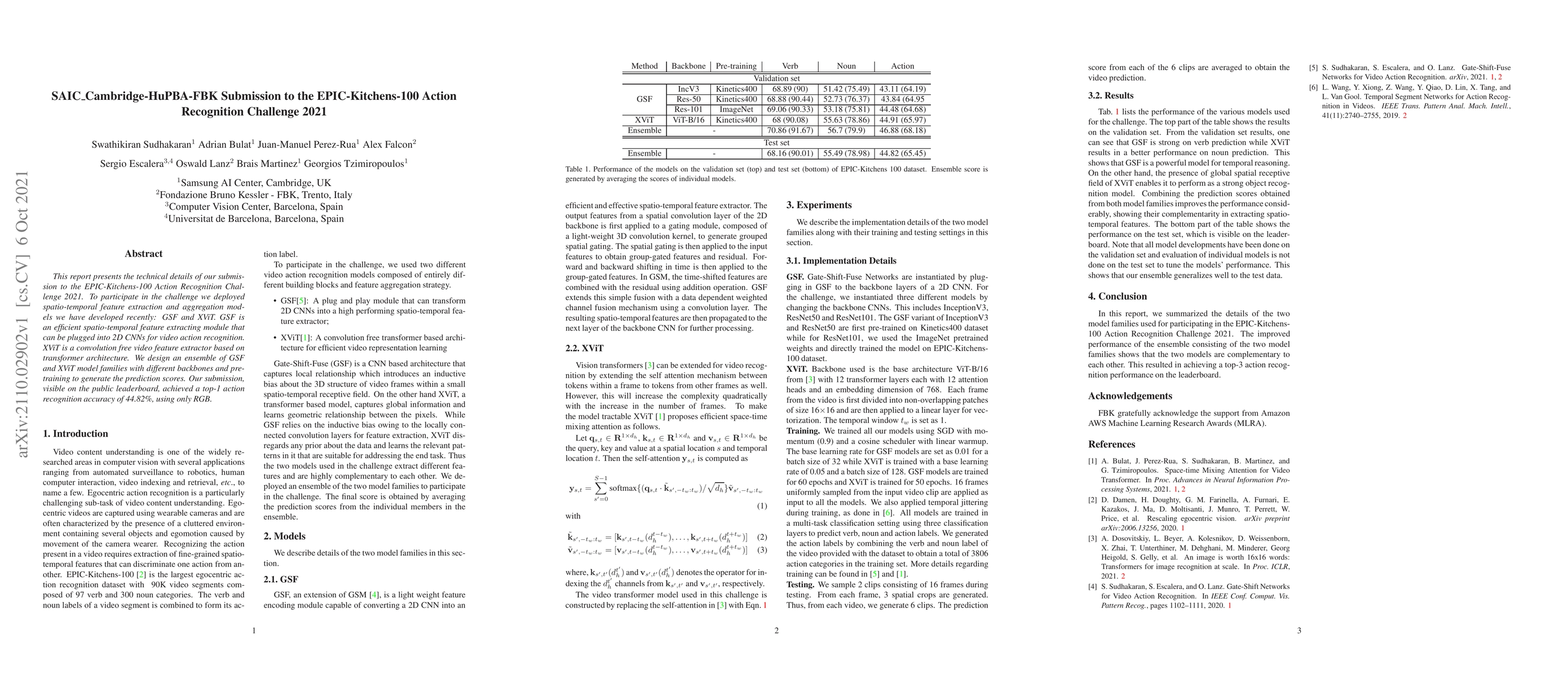 This report presents the technical details of our submission to the EPIC-Kitchens-100 Action Recognition Challenge 2021. To participate in the challenge we deployed spatio-temporal feature extraction and aggregation models we have developed recently: GSF and XViT. GSF is an efficient spatio-temporal feature extracting module that can be plugged into 2D CNNs for video action recognition. XViT is a convolution free video feature extractor based on transformer architecture. We design an ensemble of GSF and XViT model families with different backbones and pretraining to generate the prediction scores. Our submission, visible on the public leaderboard, achieved a top-1 action recognition accuracy of 44.82%, using only RGB.