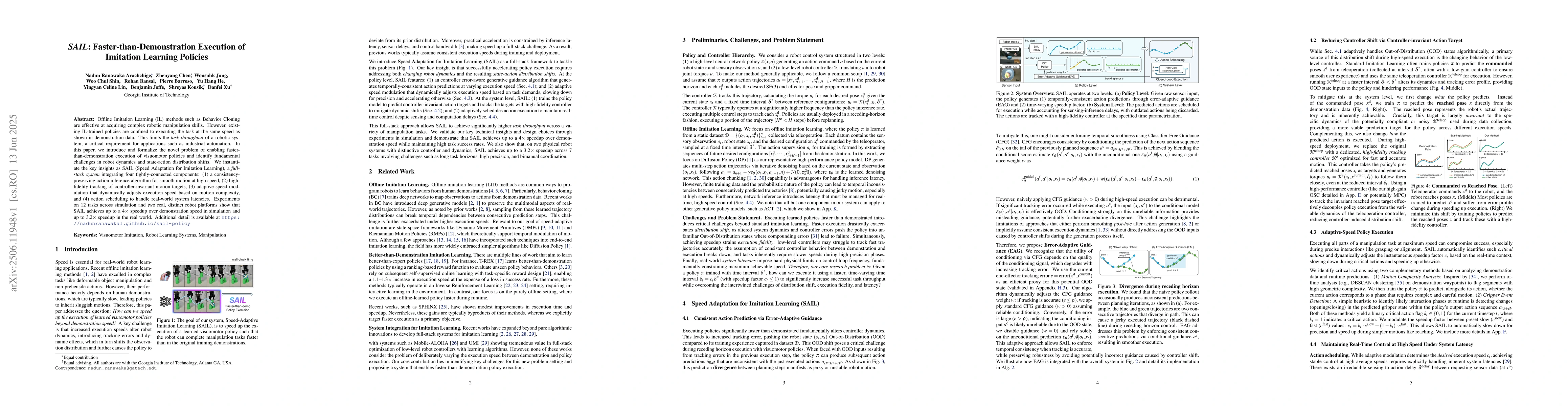 SAIL is novel in its comprehensive approach to enabling faster-than-demonstration execution of IL policies, addressing challenges in robot dynamics and state-action distribution shifts through a full-stack system.