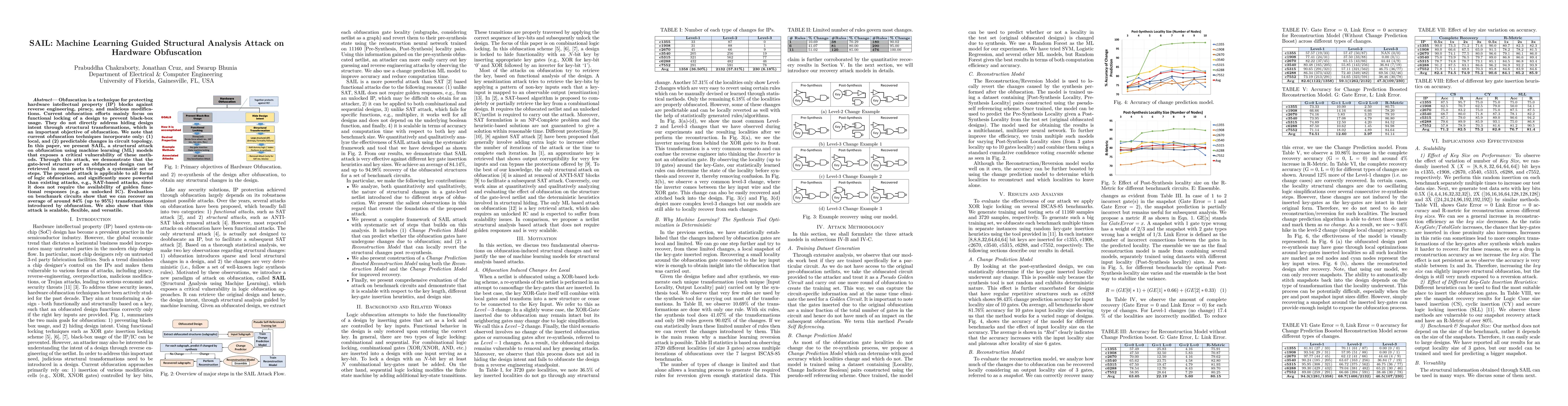 This paper introduces SAIL, a machine learning-guided structural attack on hardware obfuscation techniques, revealing significant vulnerabilities in current obfuscation methods that rely on predictable changes in circuit topology. The attack can recover up to 95% of obfuscated transformations, demonstrating its scalability and effectiveness against various logic obfuscation techniques.