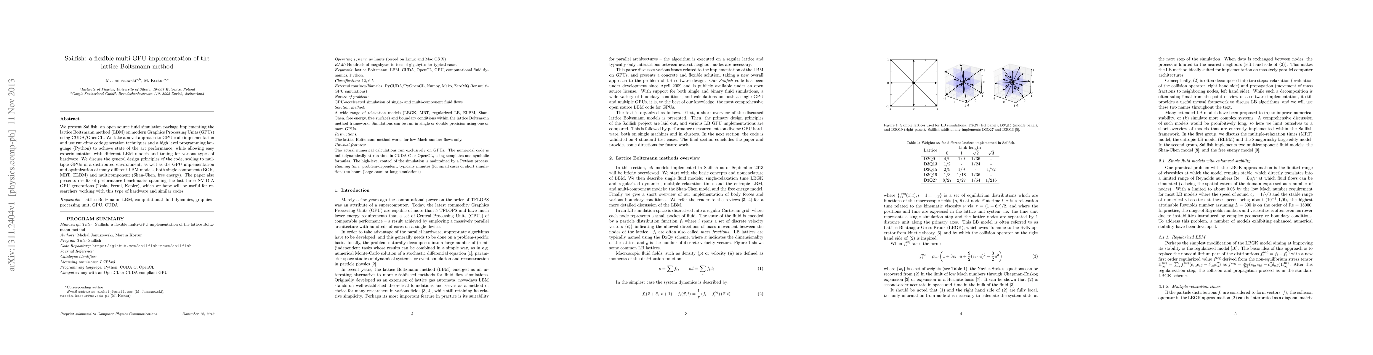 Sailfish is an open-source fluid simulation package using the lattice Boltzmann method on GPUs with CUDA/OpenCL, employing runtime code generation and Python for high-performance and flexibility. It scales to multiple GPUs and benchmarks performance across recent NVIDIA GPU generations.