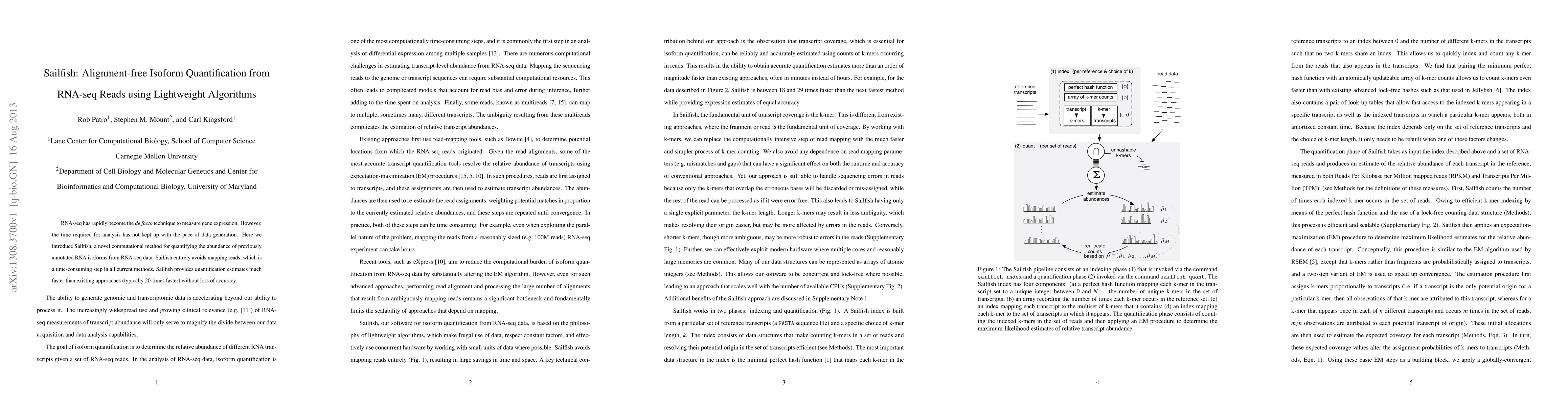 Sailfish is a computational method for fast quantification of RNA isoforms from RNA-seq data without the need for read mapping, achieving significantly faster results (typically 20-times) compared to traditional methods while maintaining accuracy.