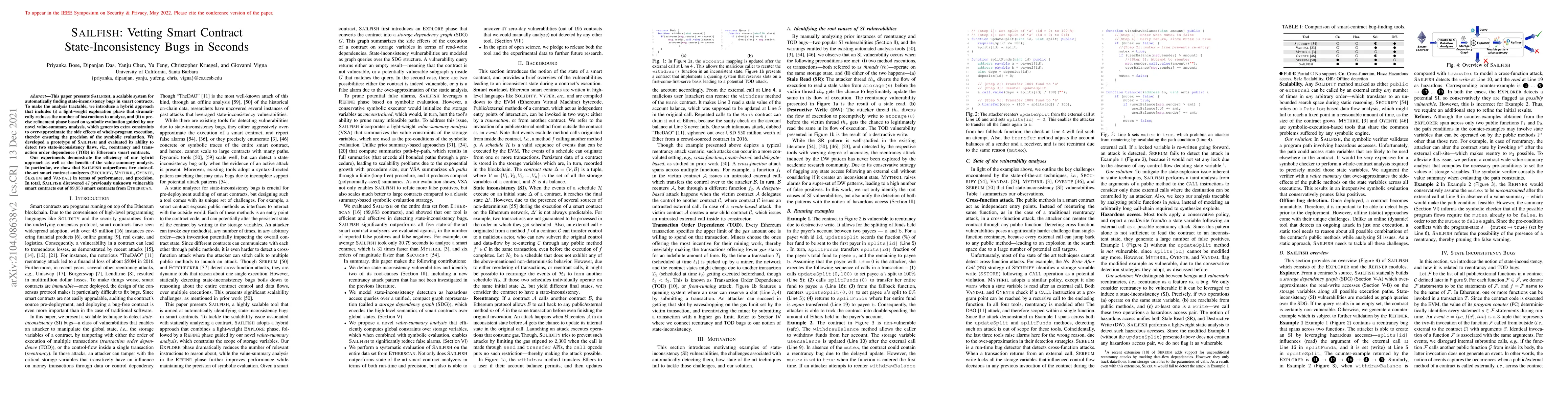 This paper presents SAILFISH, a scalable system for automatically finding state-inconsistency bugs in smart contracts. To make the analysis tractable, we introduce a hybrid approach that includes (i) a light-weight exploration phase that dramatically reduces the number of instructions to analyze, and (ii) a precise refinement phase based on symbolic evaluation guided by our novel value-summary analysis, which generates extra constraints to over-approximate the side effects of whole-program execution, thereby ensuring the precision of the symbolic evaluation. We developed a prototype of SAILFISH and evaluated its ability to detect two state-inconsistency flaws, viz., reentrancy and transaction order dependence (TOD) in Ethereum smart contracts. Further, we present detection rules for other kinds of smart contract flaws that SAILFISH can be extended to detect. Our experiments demonstrate the efficiency of our hybrid approach as well as the benefit of the value summary analysis. In particular, we show that S SAILFISH outperforms five state-of-the-art smart contract analyzers (SECURITY, MYTHRIL, OYENTE, SEREUM and VANDAL ) in terms of performance, and precision. In total, SAILFISH discovered 47 previously unknown vulnerable smart contracts out of 89,853 smart contracts from ETHERSCAN .