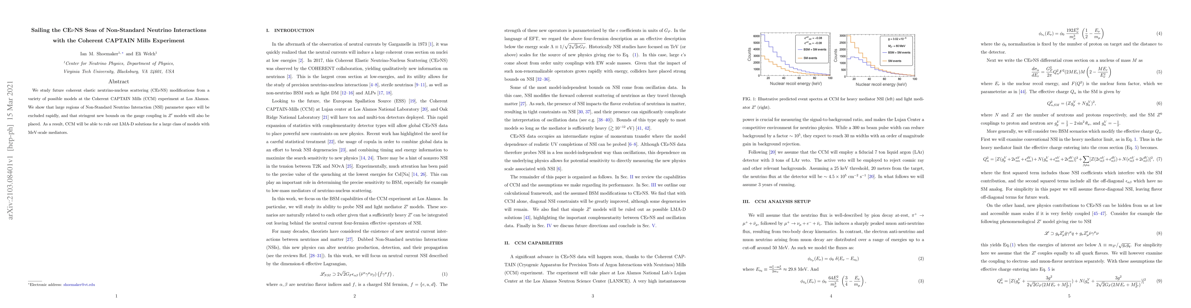 This paper investigates how the Coherent CAPTAIN Mills (CCM) experiment can detect modifications in coherent elastic neutrino-nucleus scattering (CEνNS) due to Non-Standard Neutrino Interactions (NSI). It demonstrates that CCM will rapidly exclude large regions of NSI parameter space and set stringent new bounds on gauge couplings in $Z'$ models, effectively ruling out LMA-D solutions for MeV-scale mediator models.