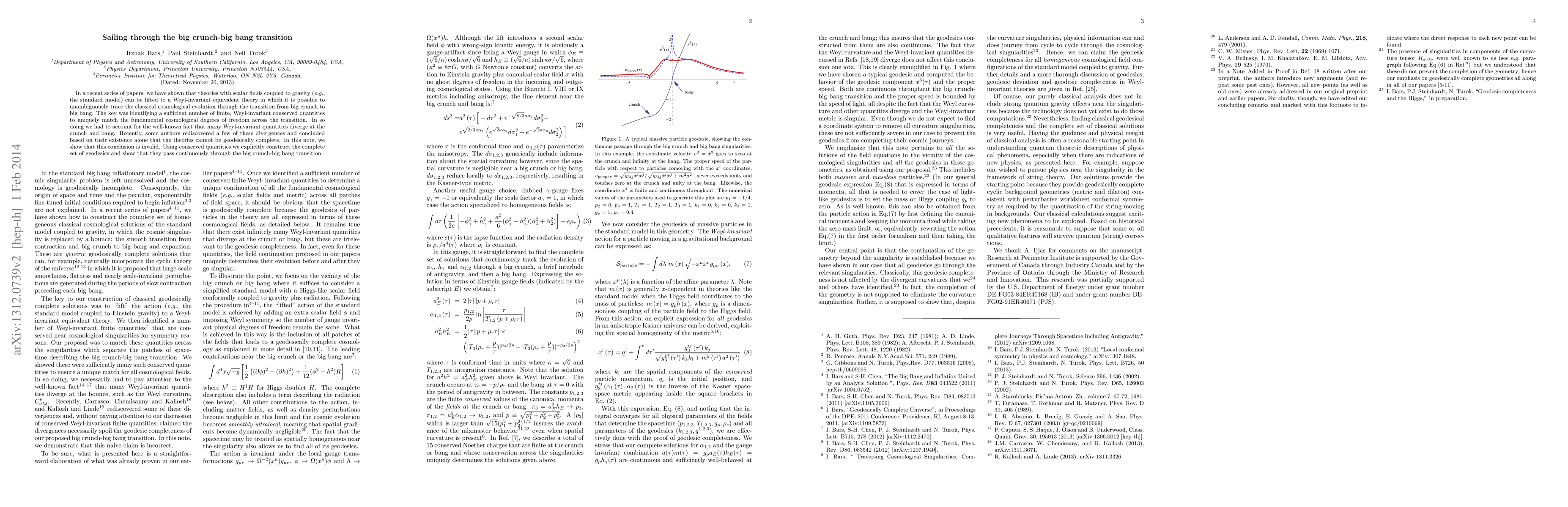 This paper demonstrates that scalar field theories coupled to gravity can be reformulated in a Weyl-invariant manner to trace cosmological evolution from a big crunch to a big bang, despite divergences. It refutes claims of geodesic incompleteness, showing that conserved quantities enable a continuous transition through the cosmological transition.