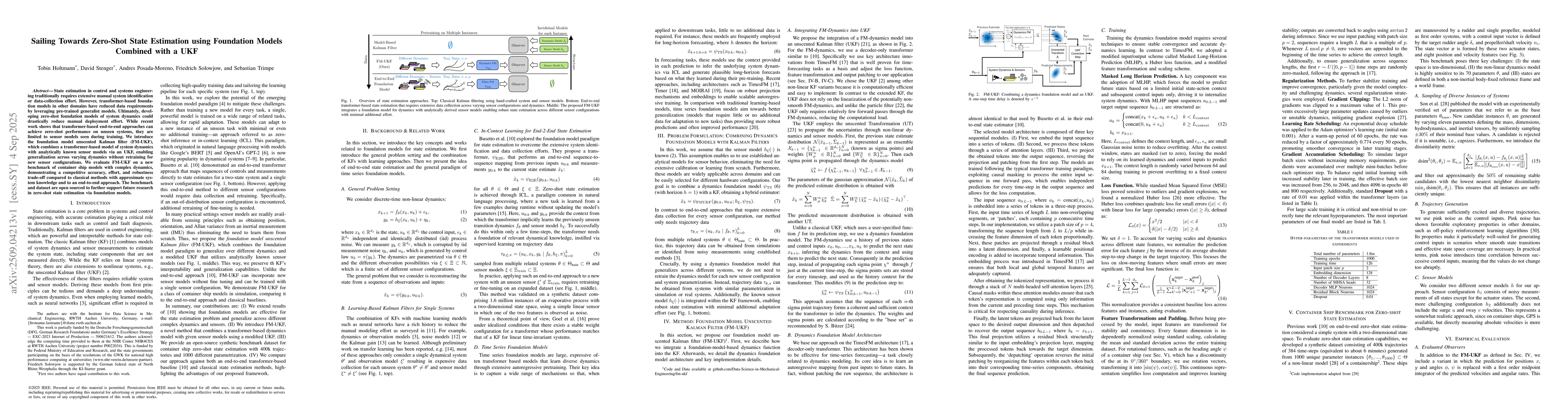 State estimation in control and systems engineering traditionally requires extensive manual system identification or data-collection effort. However, transformer-based foundation models in other domains have reduced data requirements by leveraging pre-trained generalist models. Ultimately, developing zero-shot foundation models of system dynamics could drastically reduce manual deployment effort. While recent work shows that transformer-based end-to-end approaches can achieve zero-shot performance on unseen systems, they are limited to sensor models seen during training. We introduce the foundation model unscented Kalman filter (FM-UKF), which combines a transformer-based model of system dynamics with analytically known sensor models via an UKF, enabling generalization across varying dynamics without retraining for new sensor configurations. We evaluate FM-UKF on a new benchmark of container ship models with complex dynamics, demonstrating a competitive accuracy, effort, and robustness trade-off compared to classical methods with approximate system knowledge and to an end-to-end approach. The benchmark and dataset are open sourced to further support future research in zero-shot state estimation via foundation models.