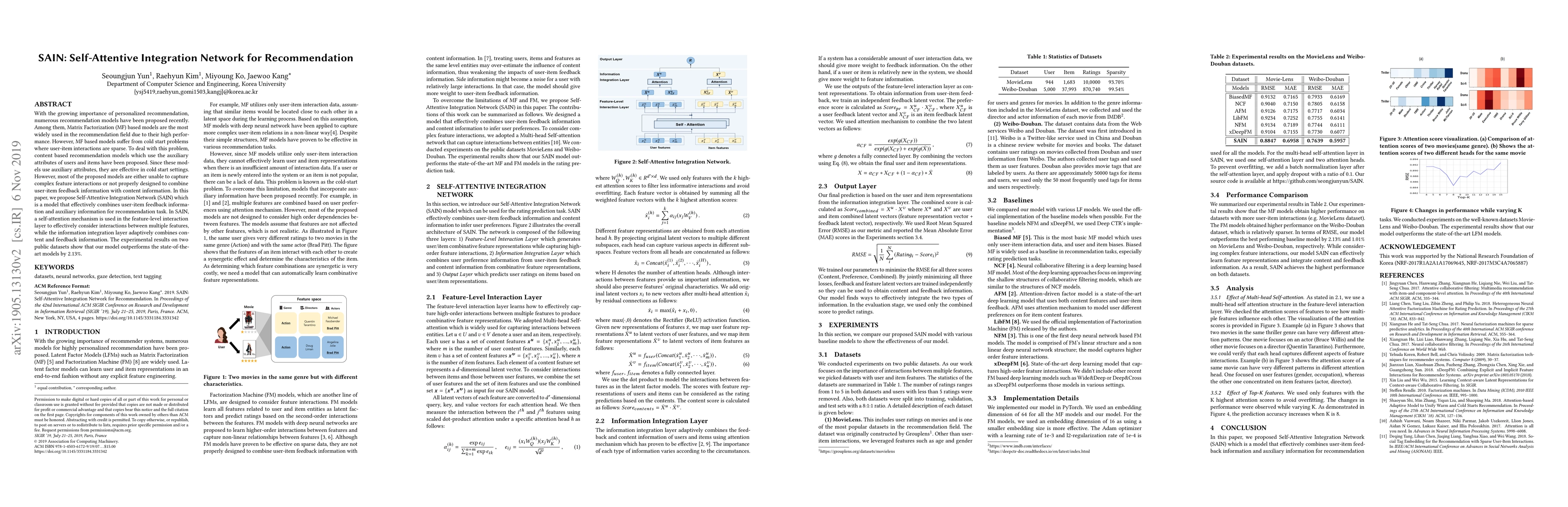 The paper proposes the Self-Attentive Integration Network (SAIN) to enhance personalized recommendation by combining user-item feedback and auxiliary content information. SAIN uses a self-attention mechanism to capture complex feature interactions and an adaptive integration layer to merge content and feedback data, outperforming state-of-the-art models by 2.13% on public datasets.