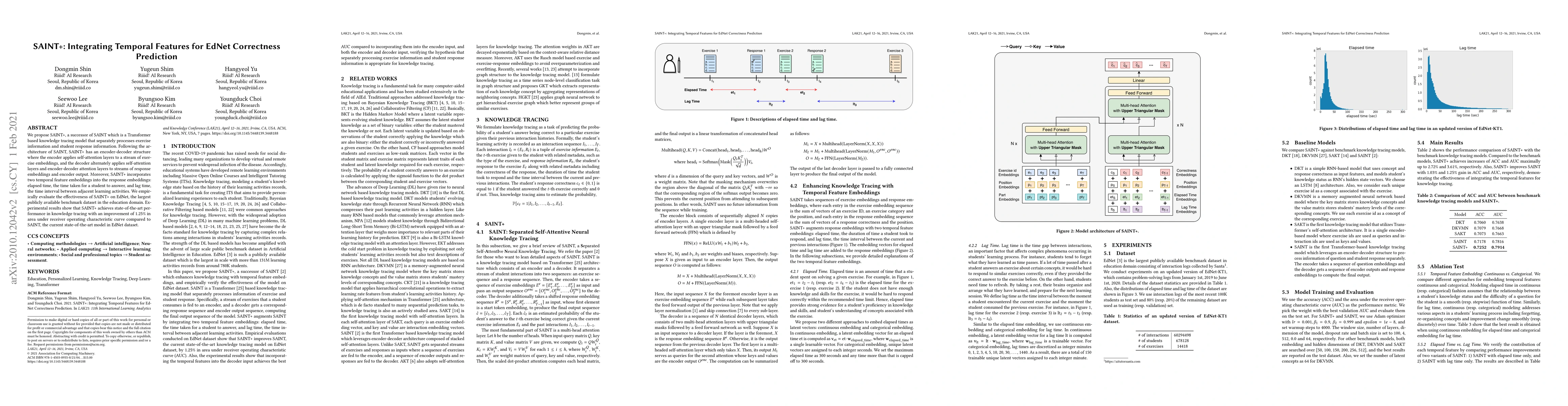 SAINT+ enhances the SAINT model with temporal feature embeddings to improve knowledge tracing accuracy. It achieves state-of-the-art performance on EdNet, demonstrating a 1.25% improvement in the area under the ROC curve compared to its predecessor.