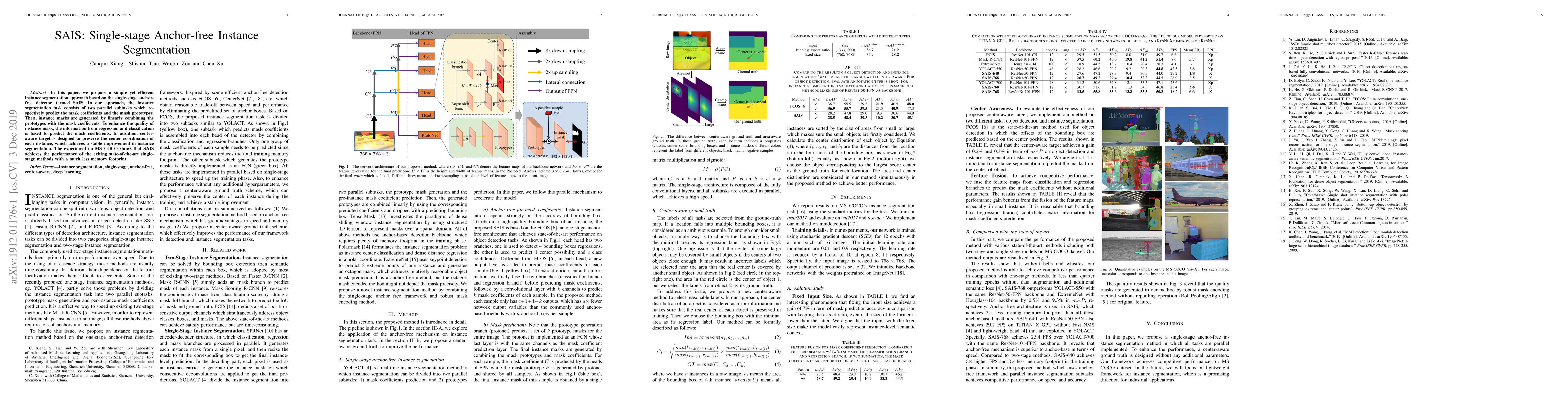 The paper introduces SAIS, a single-stage anchor-free instance segmentation method that predicts mask coefficients and prototypes in parallel to generate instance masks. It combines regression and classification information to enhance mask quality and uses a center-aware target for stable performance improvements, achieving state-of-the-art results with lower memory usage on MS COCO.