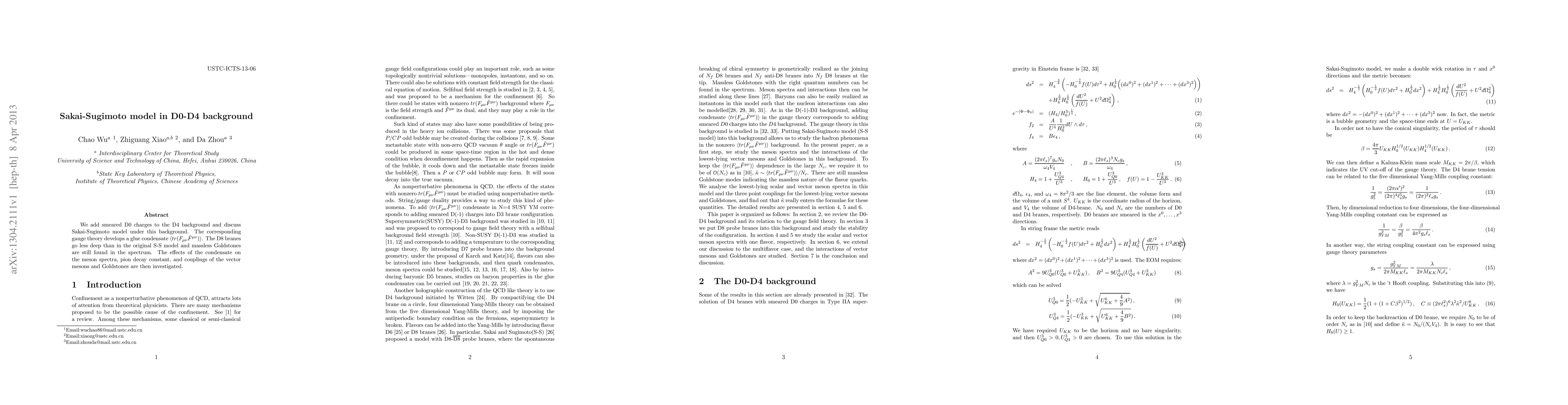 This paper examines the Sakai-Sugimoto model with additional smeared D0 charges in a D4 background, noting that D8 branes penetrate less deeply and massless Goldstone bosons remain. It investigates the impact of a condensate on meson spectra, pion decay constant, and vector meson and Goldstone couplings.