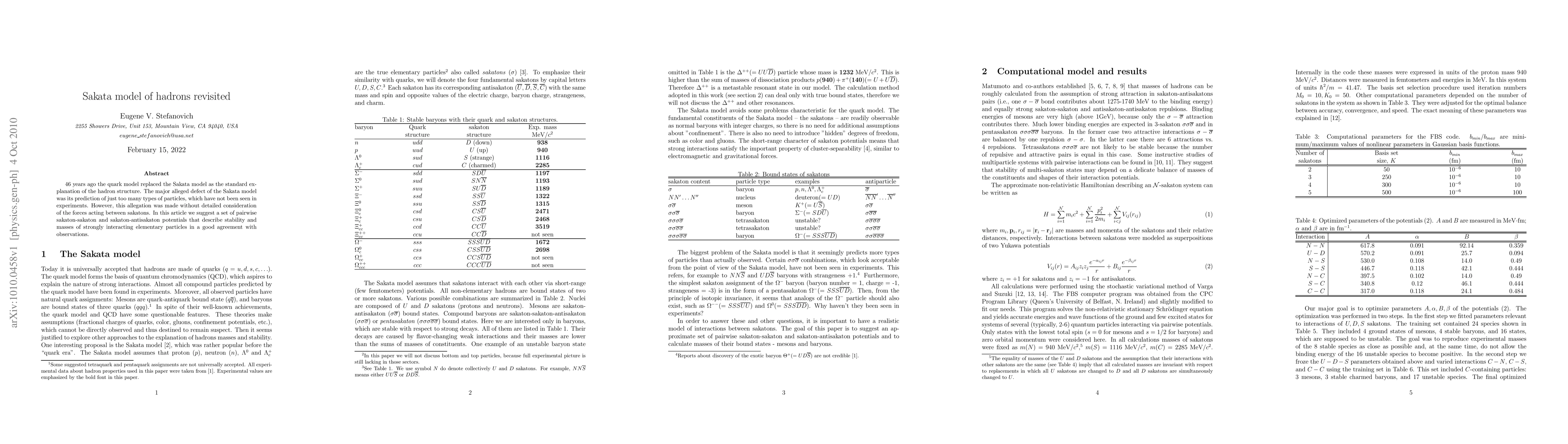 46 years ago the quark model replaced the Sakata model as the standard explanation of the hadron structure. The major alleged defect of the Sakata model was its prediction of just too many types of particles, which have not been seen in experiments. However, this allegation was made without detailed consideration of the forces acting between sakatons. In this article we suggest a set of pairwise sakaton-sakaton and sakaton-antisakaton potentials that describe stability and masses of strongly interacting elementary particles in a good agreement with observations.