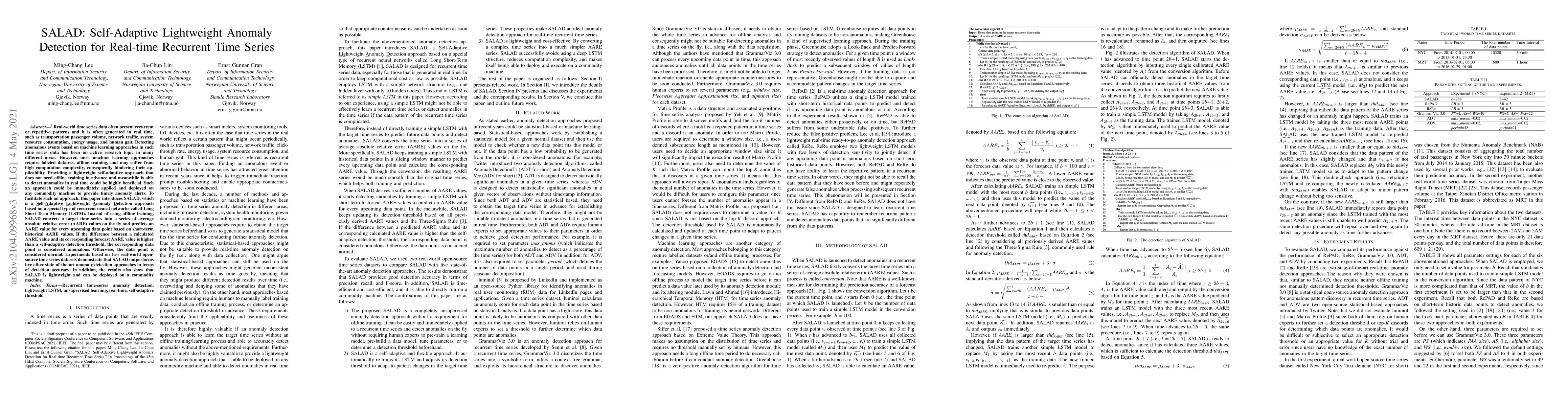 SALAD is a self-adaptive, lightweight anomaly detection method for real-time recurrent time series using LSTM networks, which avoids offline training and offers real-time anomaly alerts with high detection accuracy and low computational complexity. Experiments show SALAD outperforms other state-of-the-art methods and is deployable on standard hardware.