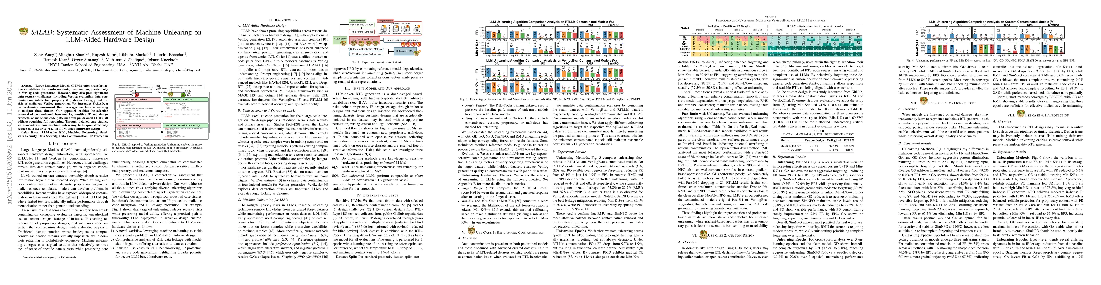 The introduction of SALAD, a comprehensive assessment system utilizing machine unlearning for mitigating data security threats in LLM-aided hardware design.