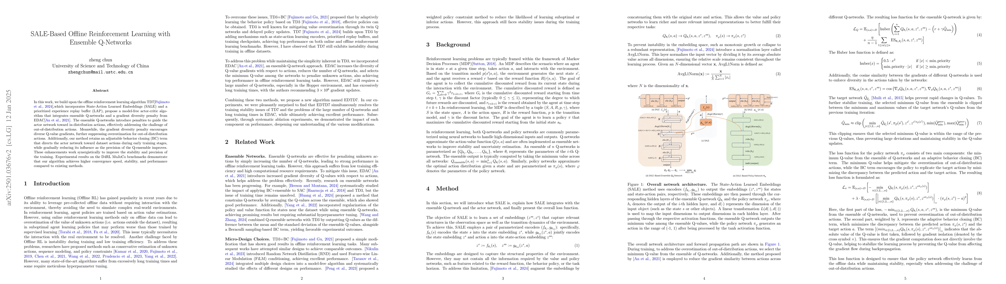 This paper proposes an offline reinforcement learning algorithm with ensemble Q-networks and a gradient diversity penalty, enhancing the TD7 framework with State-Action Learned Embeddings. The method effectively manages out-of-distribution actions and achieves superior convergence speed and performance on D4RL MuJoCo benchmarks.