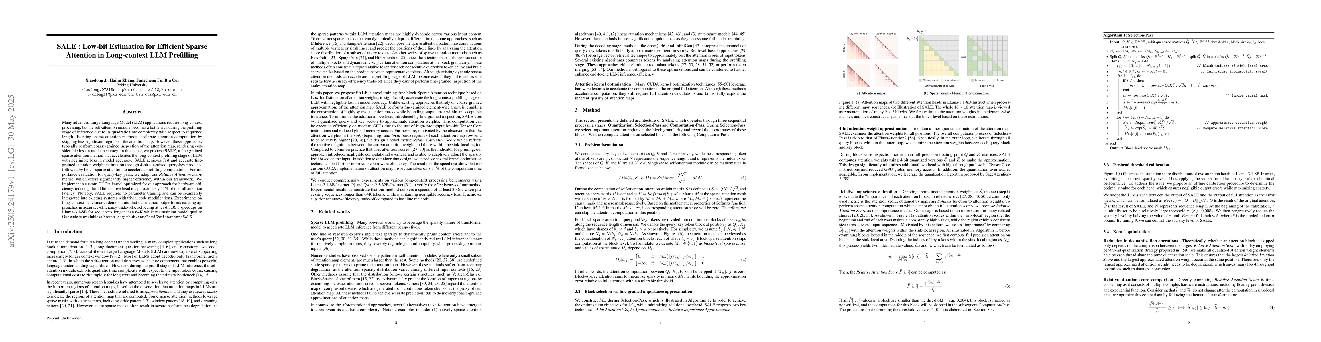 Introduces a fine-grained sparse attention method (SALE) using 4-bit quantized query-key products and block-sparse attention, optimized with a custom CUDA kernel for hardware efficiency.