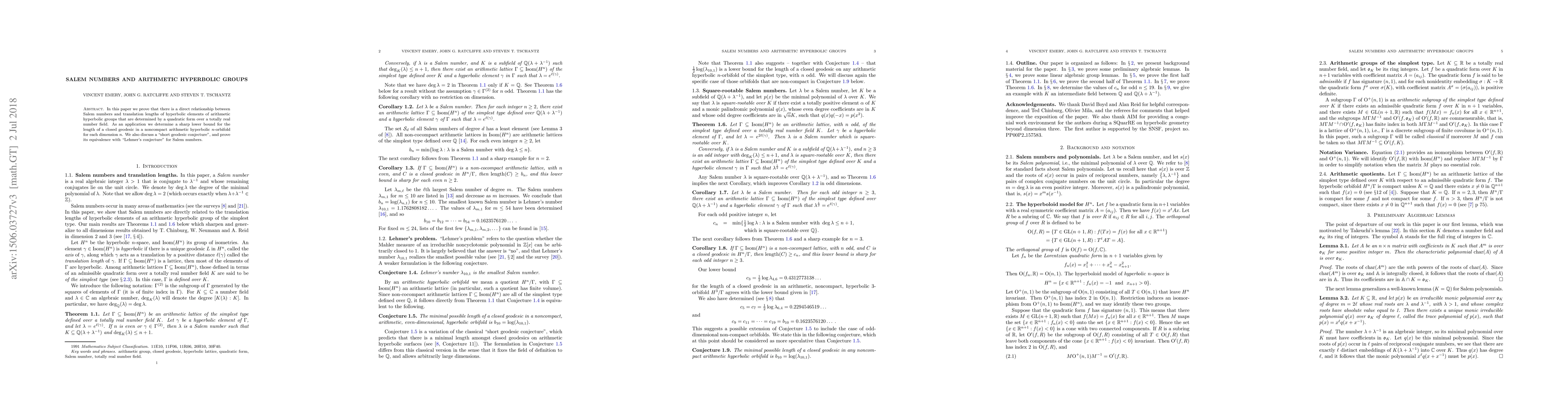 This paper establishes a connection between Salem numbers and the translation lengths of hyperbolic elements in arithmetic hyperbolic groups derived from quadratic forms over totally real number fields. It also determines a sharp lower bound for closed geodesic lengths in noncompact arithmetic hyperbolic n-orbifolds and proves the equivalence of the short geodesic conjecture with Lehmer's conjecture for Salem numbers.
