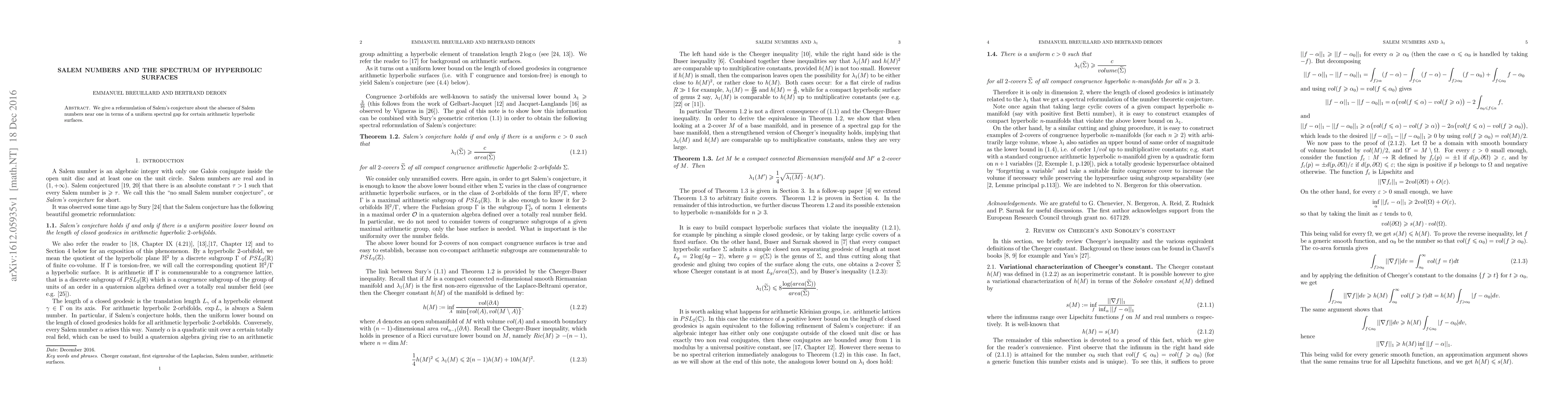 We give a reformulation of Salem's conjecture about the absence of Salem numbers near one in terms of a uniform spectral gap for certain arithmetic hyperbolic surfaces.