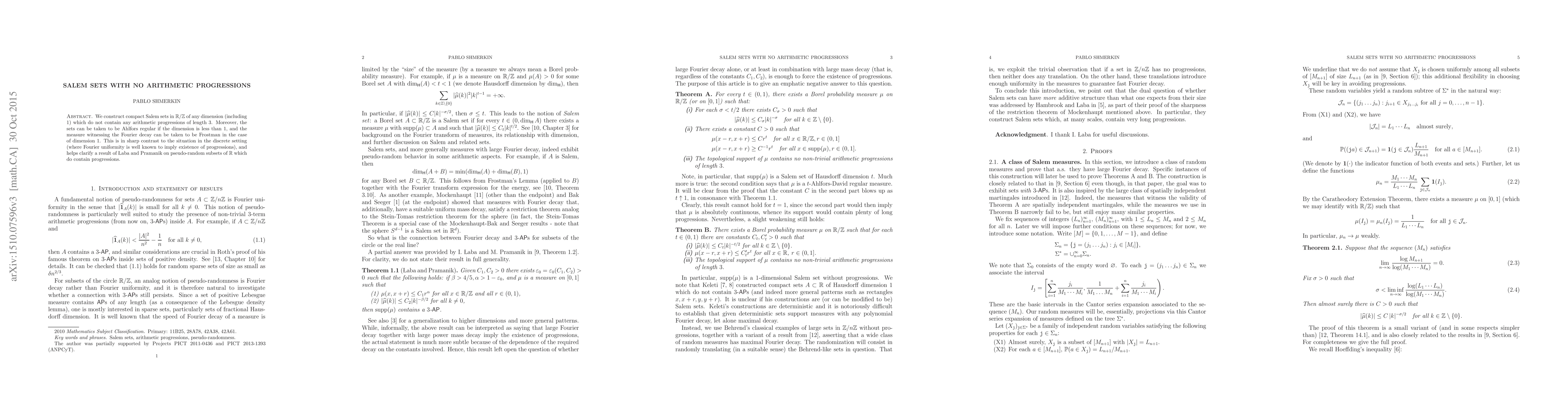 The paper constructs Salem sets in the torus $\mathbb{R}/\mathbb{Z}$ of any dimension without length-3 arithmetic progressions, with particular regularity and measure properties when the dimension is less than 1, contrasting discrete settings where Fourier uniformity implies progression existence. This aids in understanding Laba and Pramanik's findings on pseudo-random subsets containing progressions.