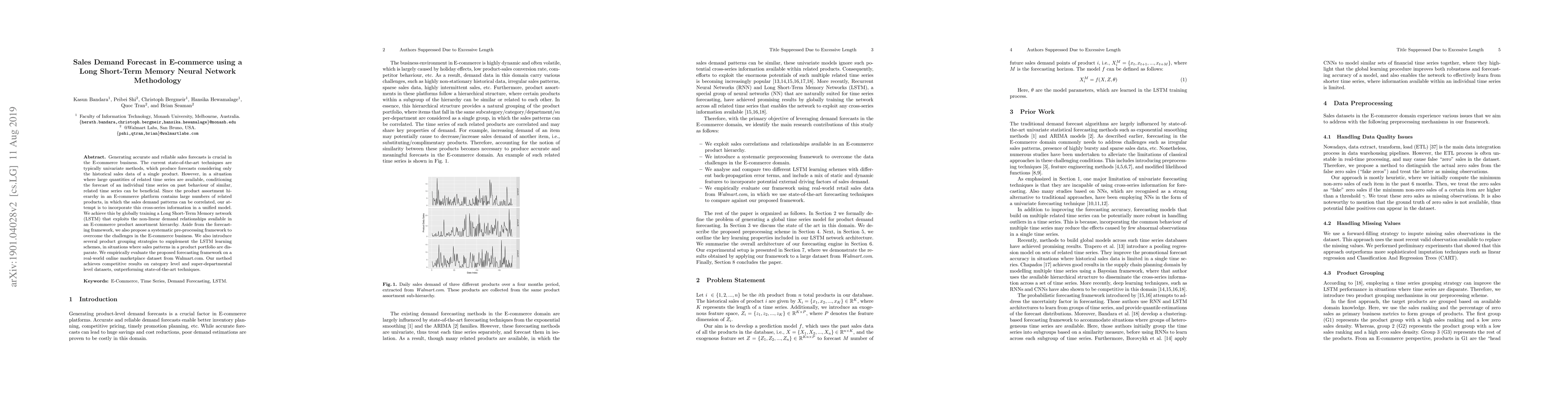 This paper proposes a Long Short-Term Memory (LSTM) neural network methodology to generate accurate sales demand forecasts in e-commerce by leveraging cross-series information from related products. The LSTM model, trained on a comprehensive dataset from Walmart.com, outperforms existing univariate methods and achieves competitive results on category and super-departmental levels.